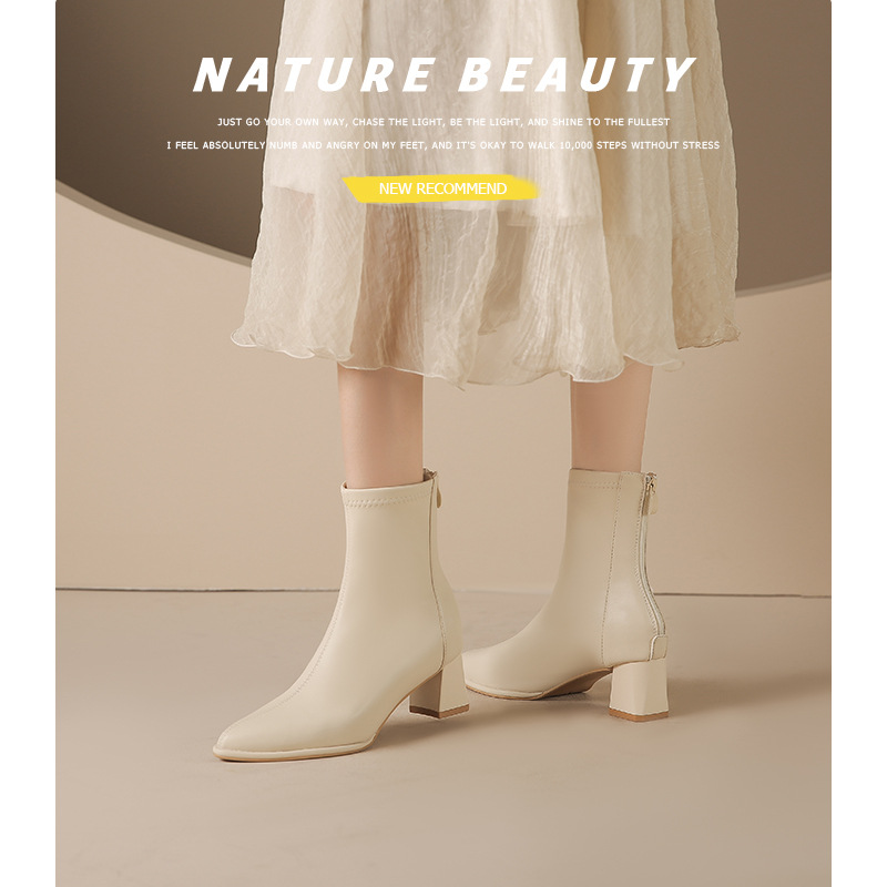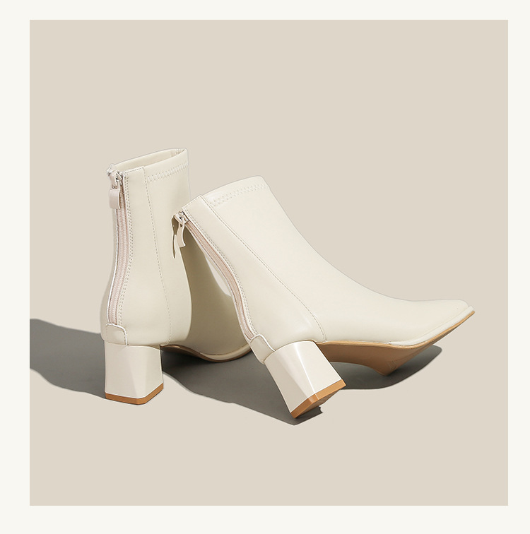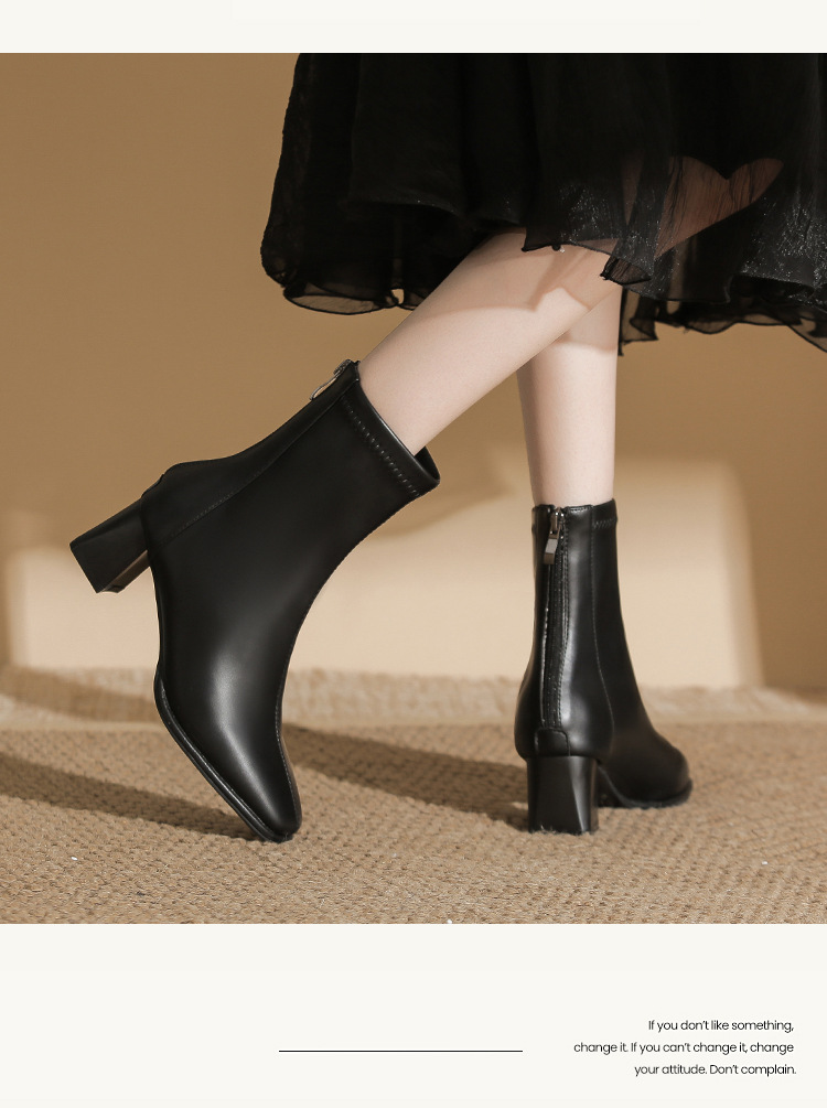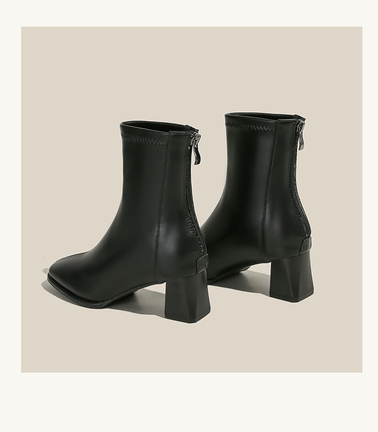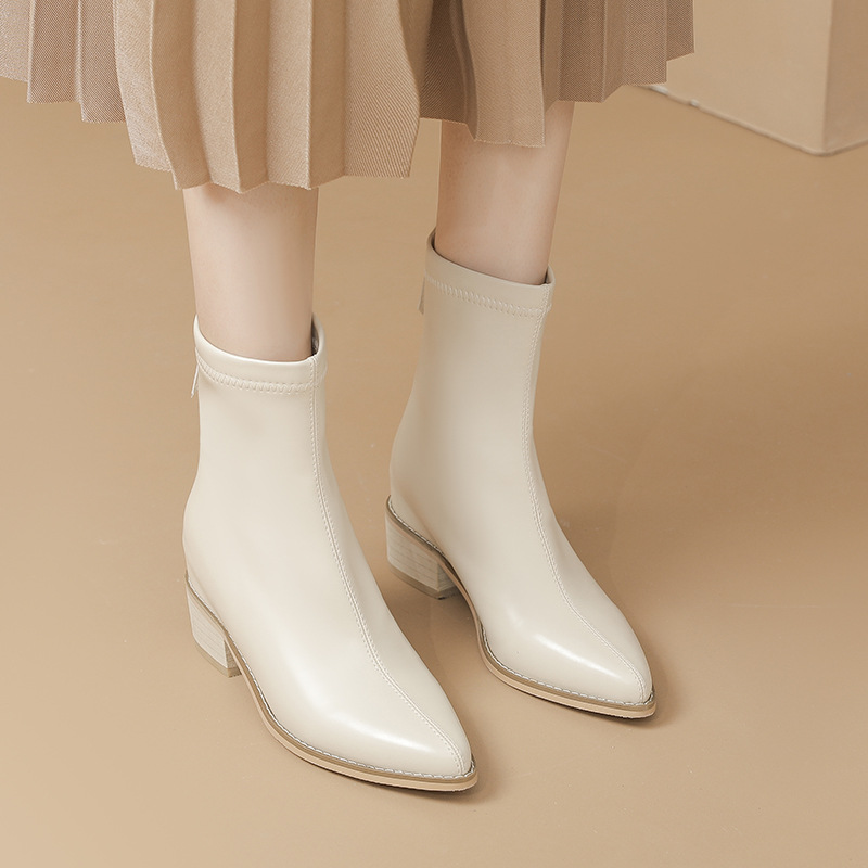 5cm既製サイズ31~40、ポインテッドトゥ、ミッドヒール、ソフトレザー、ショート丈スリムブーツ、バックジッパー、秋冬用チャンキーヒールショートブーツ、女性用