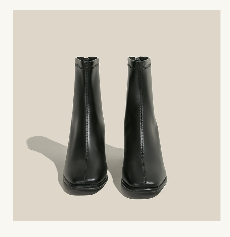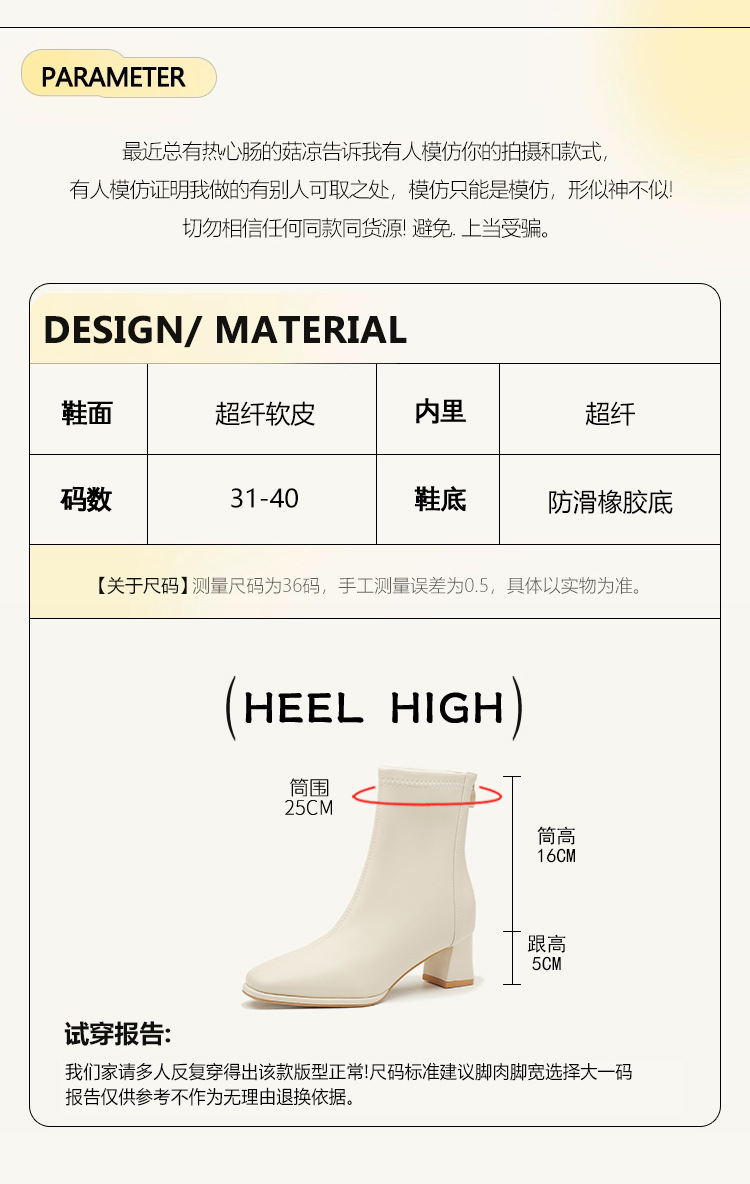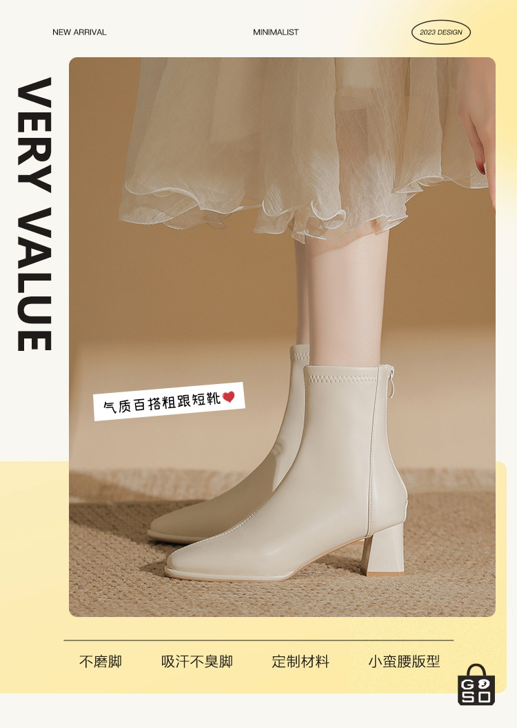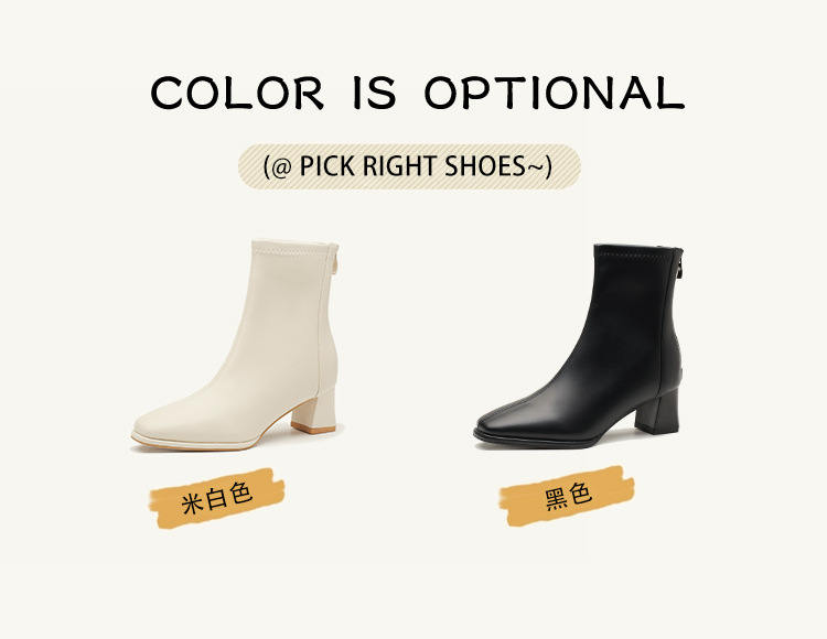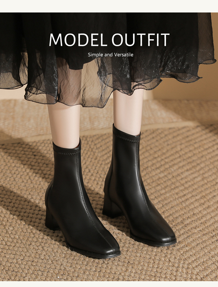 5cm既製サイズ31~40、ポインテッドトゥ、ミッドヒール、ソフトレザー、ショート丈スリムブーツ、バックジッパー、秋冬用チャンキーヒールショートブーツ、女性用
