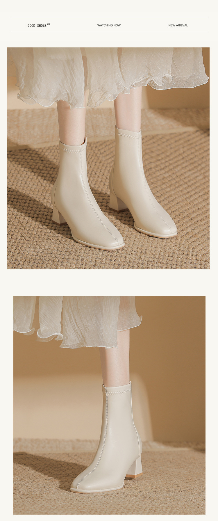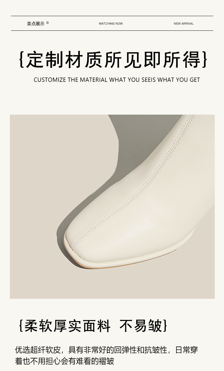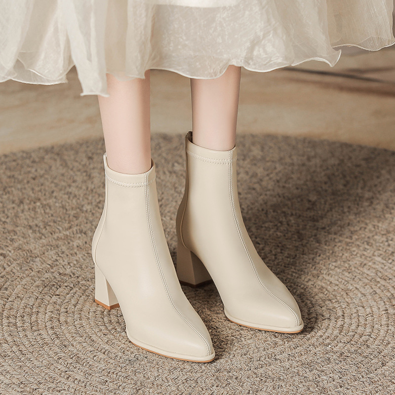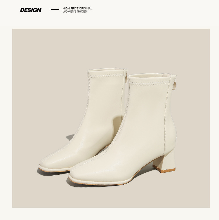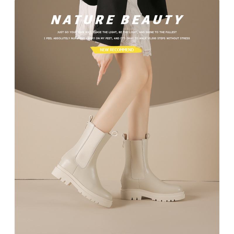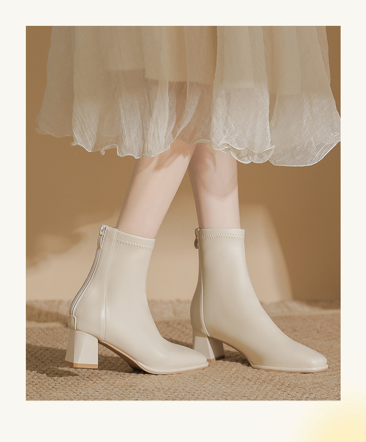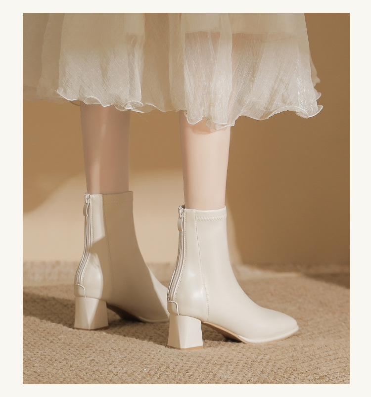 本革フレンチハイヒールショートブーツ女性用2025秋冬厚底マーティンブーツスクエアトゥホワイト高さ増加スリムブーツ