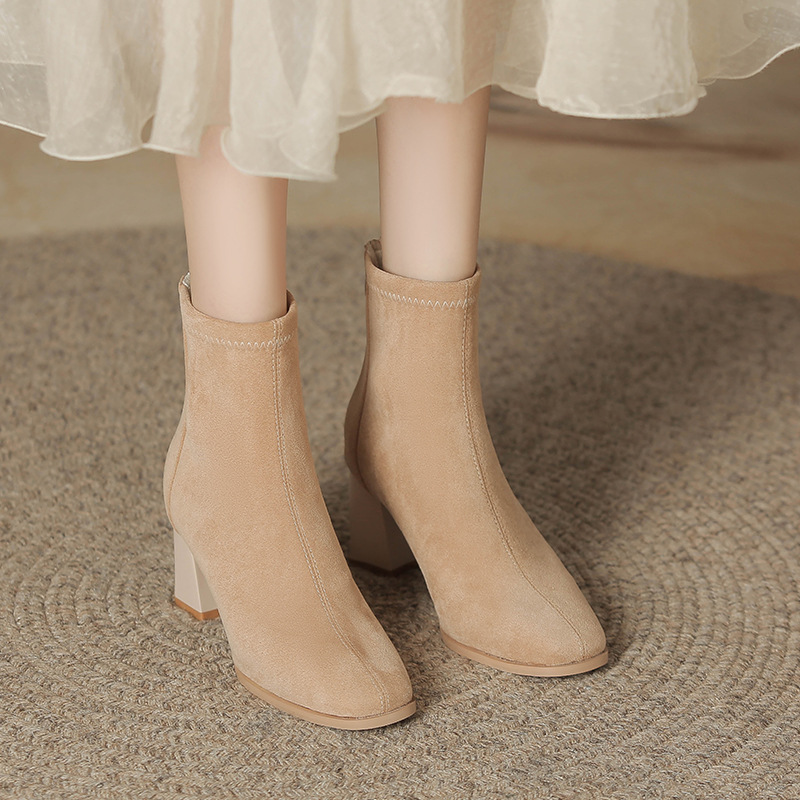5cm在庫あり サイズ31-40 ポインテッドトゥ ミドルヒール ショートブーツ 秋冬用 バックジッパー スエード素材 太ヒール 細身ブーツ