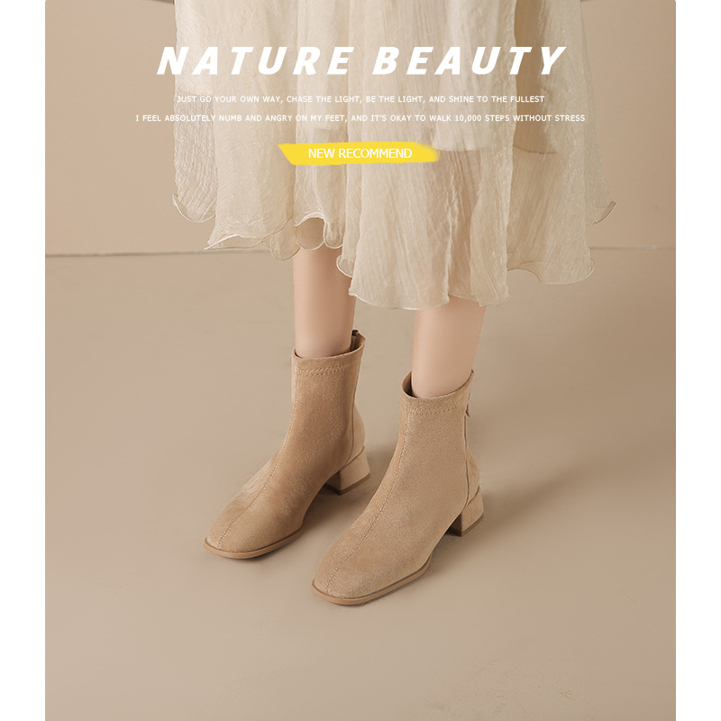 3cm在庫あり、サイズ31-40、スクエアトゥ、ミドルヒール、バックジッパー、秋冬用ショートブーツ、ショート丈、チャンキーヒール、スエード、スリムブーツ