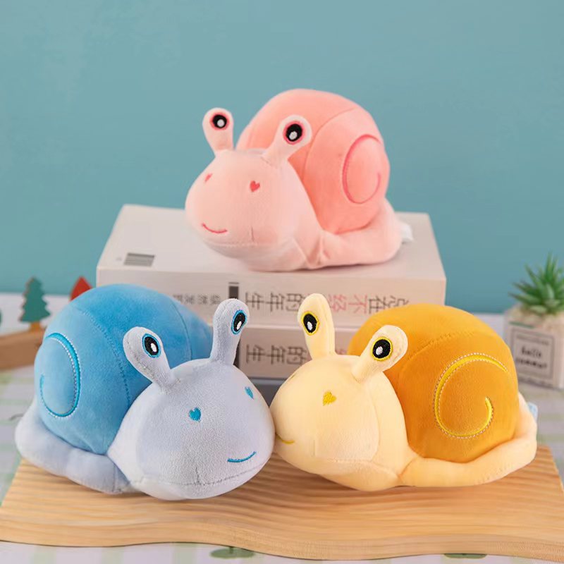 かわいいカタツムリの人形の赤ちゃんが人形をなだめるぬいぐるみの国境を越えたカタツムリの誕生日プレゼントのぬいぐるみをシミュレートします