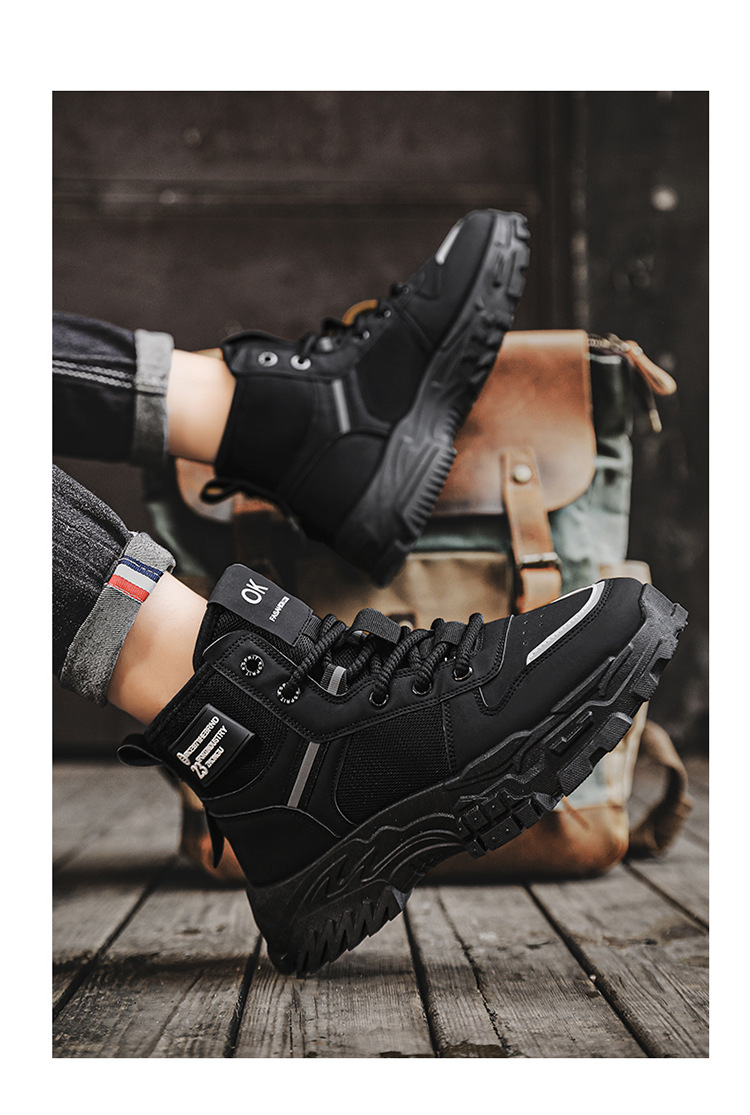 高組マーティンブーツ男靴秋の新型工装靴の流行は黒のブーツとカジュアルな労働保護靴男を組み合わせている