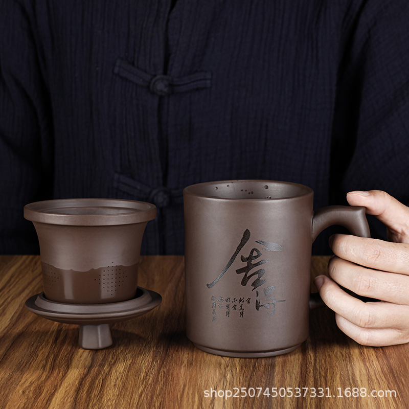 紫砂オフィスカップ茶水分離蓋付きろ過三点セット家庭用オフィス大容量カップ取っ手マグカップ