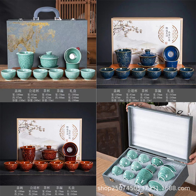 青磁祥龍浮き彫り茶器セット陶磁器工夫茶器家庭用オフィス三才蓋碗茶ギフトボックス