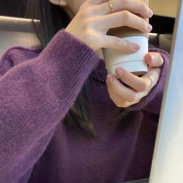 紫色毛衣女秋冬宽松内搭外穿圆领套头简约百搭软糯打底针织衫上衣