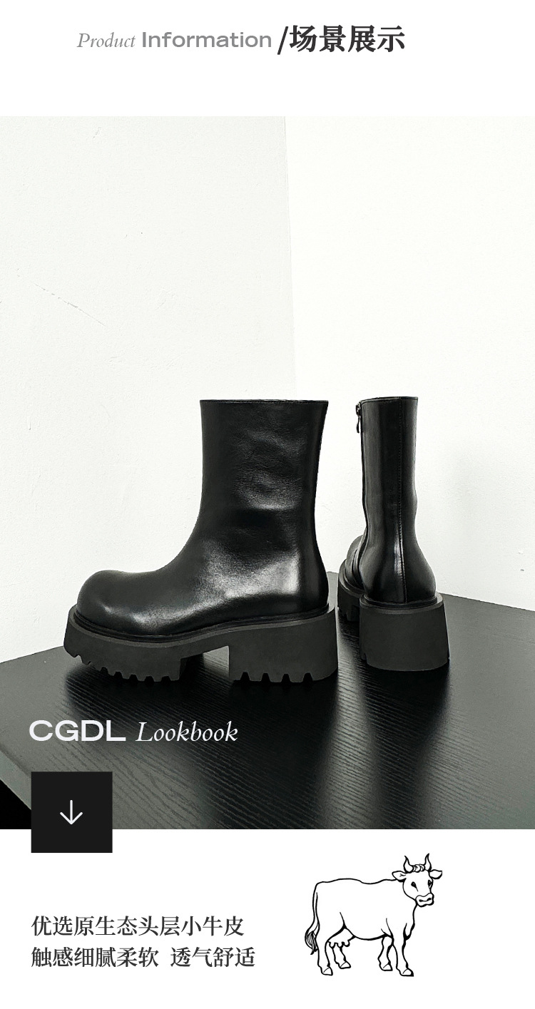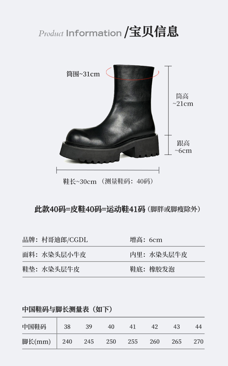 1件のオリジナルは6cmの厚い底のチェルシーの靴の男性の全頭層の牛革の大きい頭の英倫の黒いショートブーツを増加します。