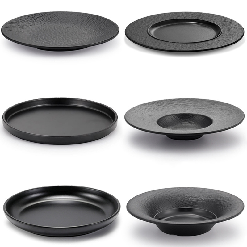 メラミン黒い皿プラスチック円盤麦わら帽子深皿洋食ステーキ皿平皿鍋焼肉料理皿商用