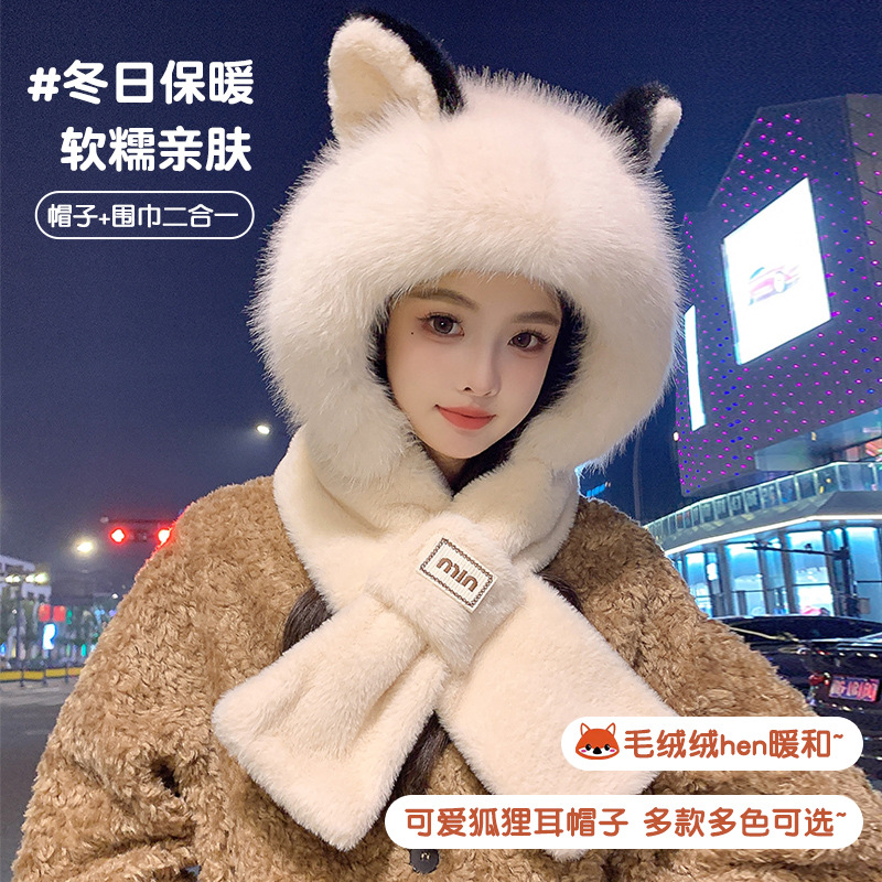 可爱毛绒帽子女冬大头围护耳加厚保暖防风帽骑车防寒三件套