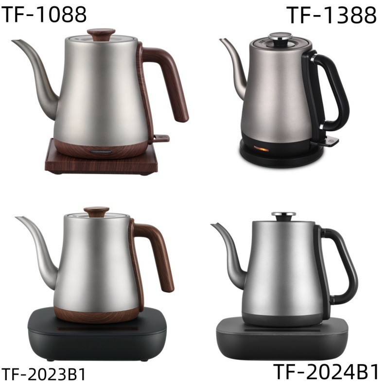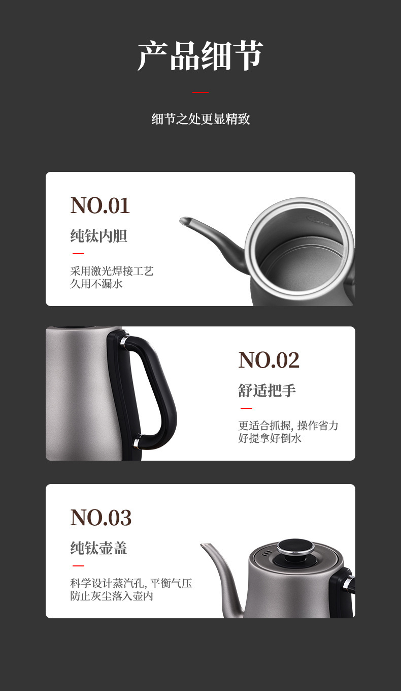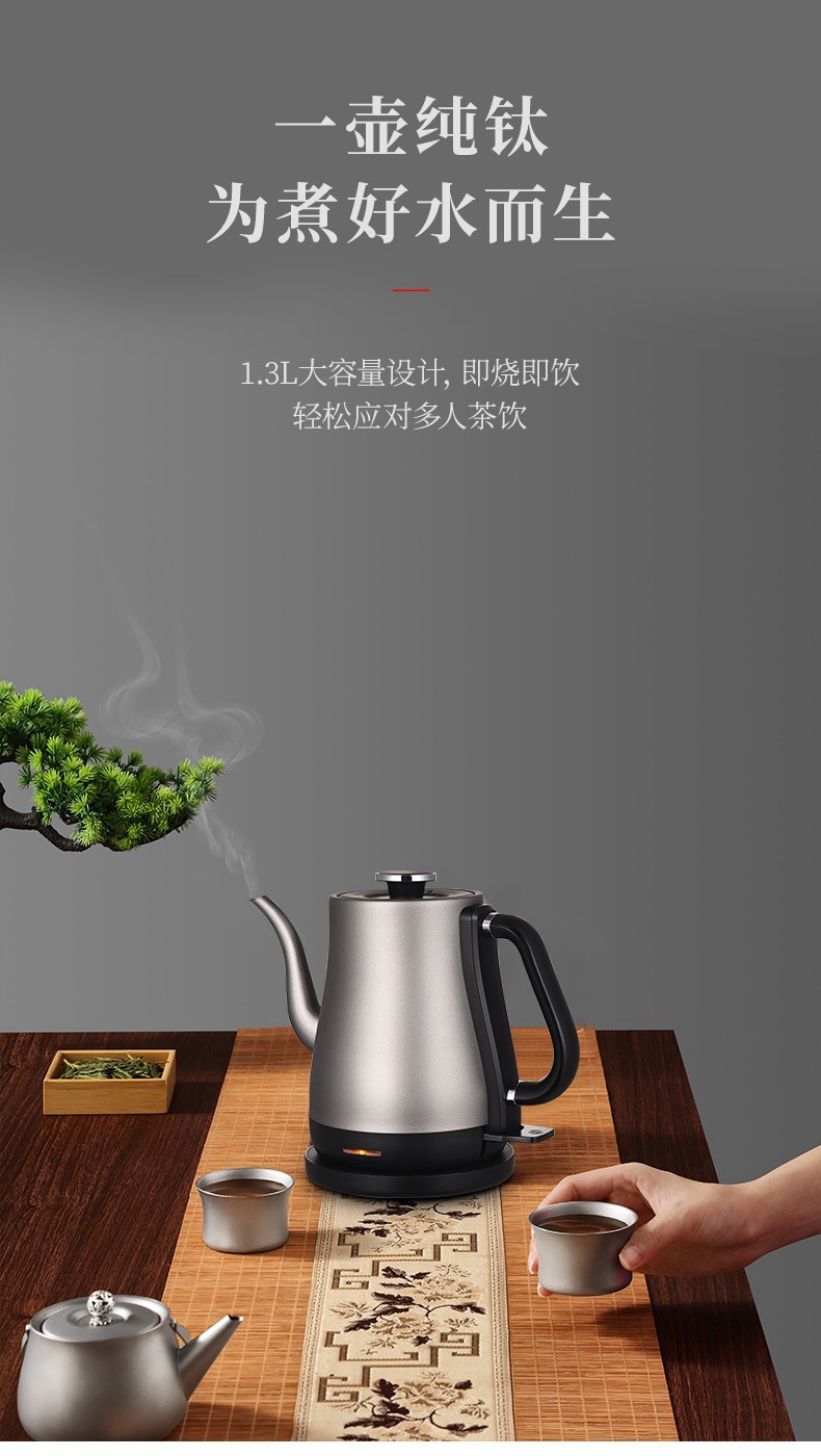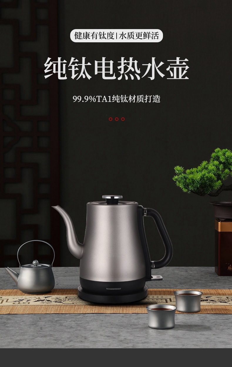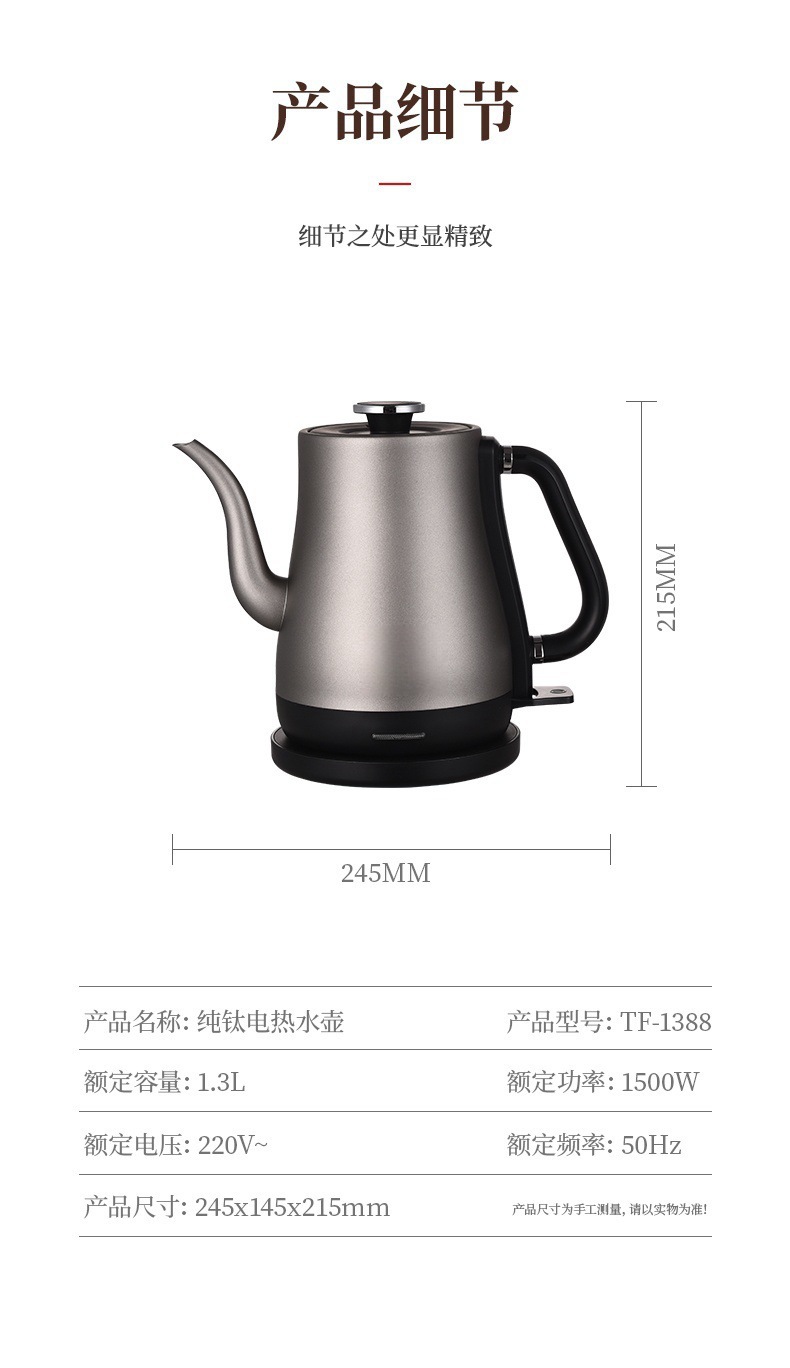 TF-1088纯钛不带抽水功能 高端机, 材料厚度0.6,手柄、盖子提手、壶托水、电源底座、开关按键全部做的水转印,表面是喷沙处理,用礼盒包装,容量为1升。