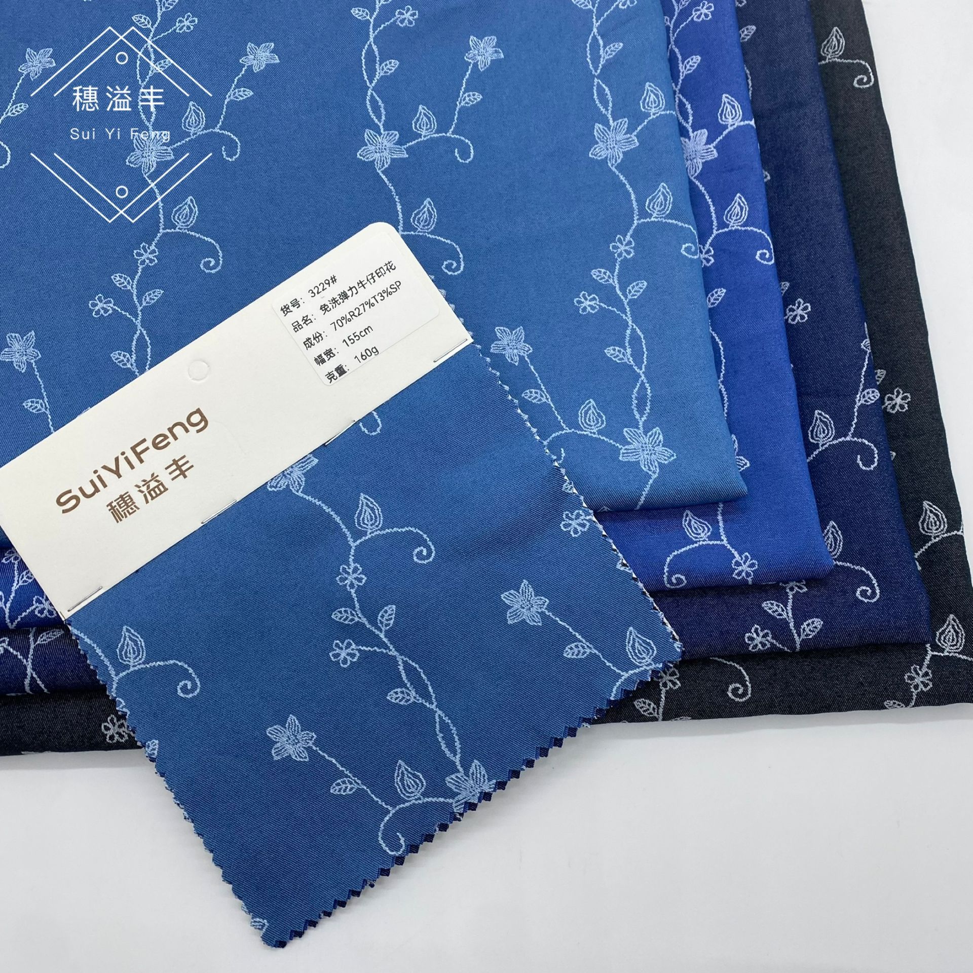 テンセル風デニム浮き出しプリント生地 快適で通気性のあるシャツ レディースワンピーススーツ生地 中国風デザイン