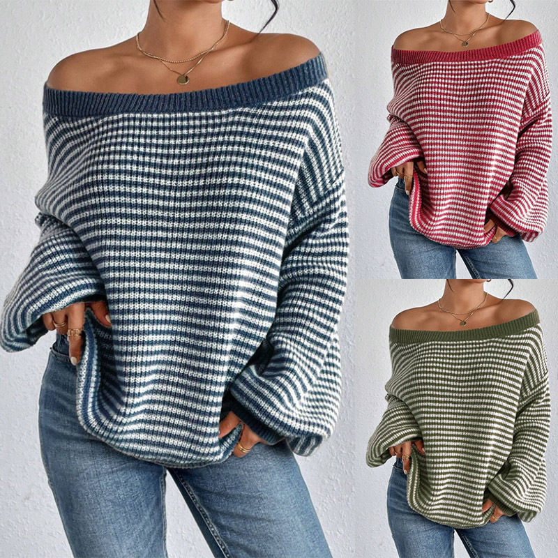 2025秋冬亚马逊一字领露肩针织衫欧美女装秋冬撞色条纹灯笼袖毛衣