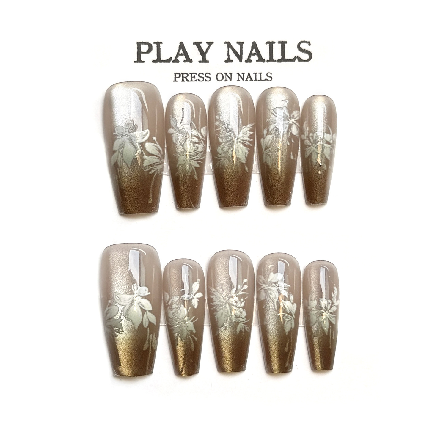 新型高級手染め台形着用甲猫眼メッキ3dレリーフネイルグラデーションレンダリング白
