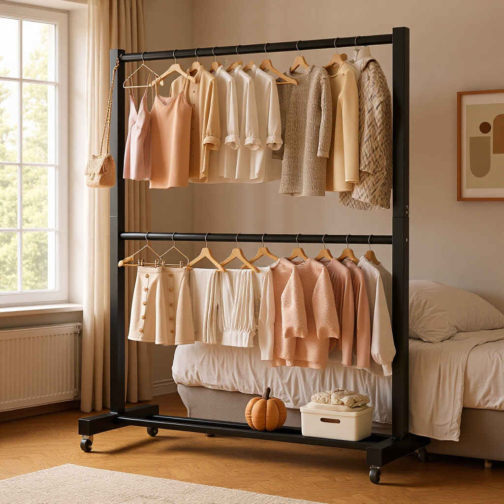 ハンガー床置き寝室クリーム風移動二重コートラックリビング仮設衣類収納掛けハンガー