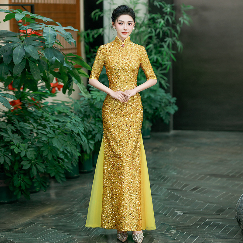 スパンコール付きチャイナドレス 新型 気品漂う エレガントなロングドレス ショーやパフォーマンスに最適 改良版ワンピース