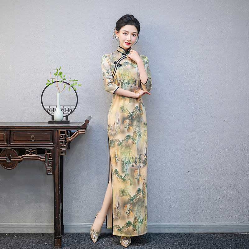 新作秋物中国風旗袍高級感婦人服グリーン七分袖改良版千里江山ワンピース