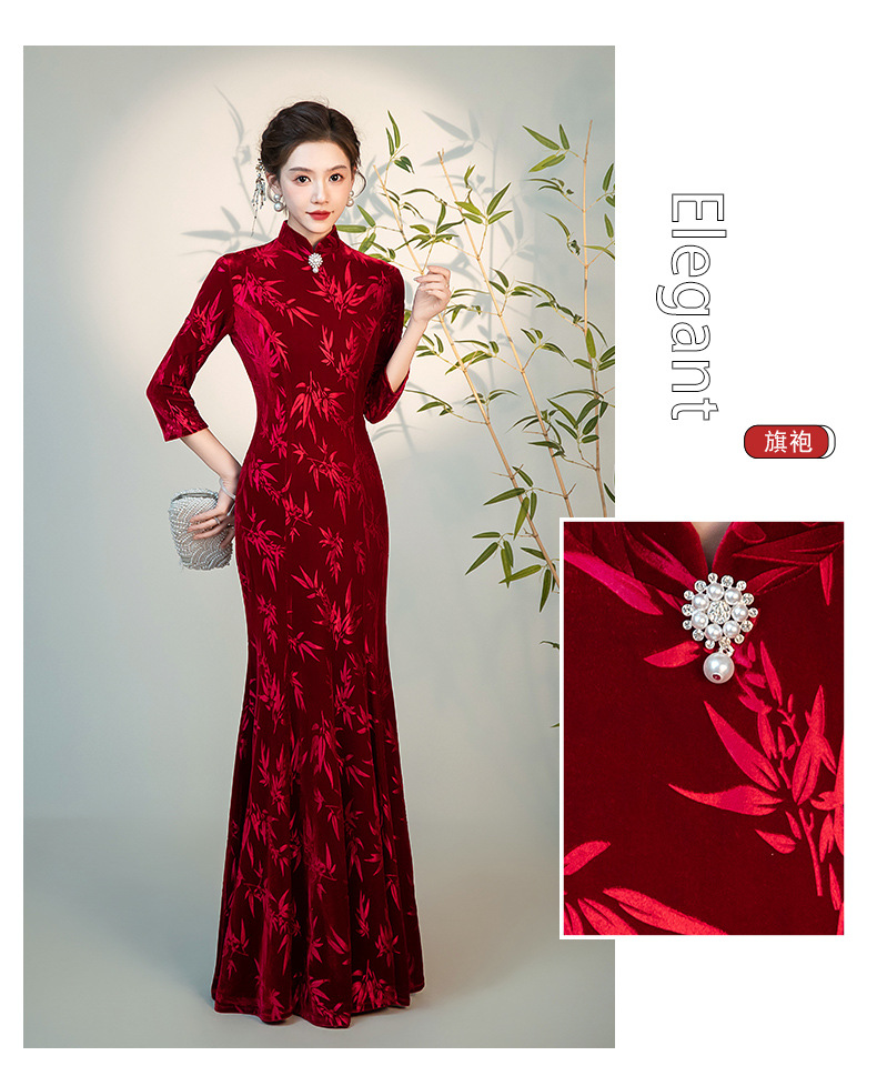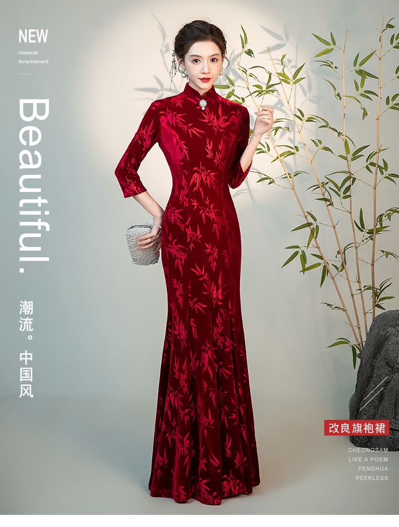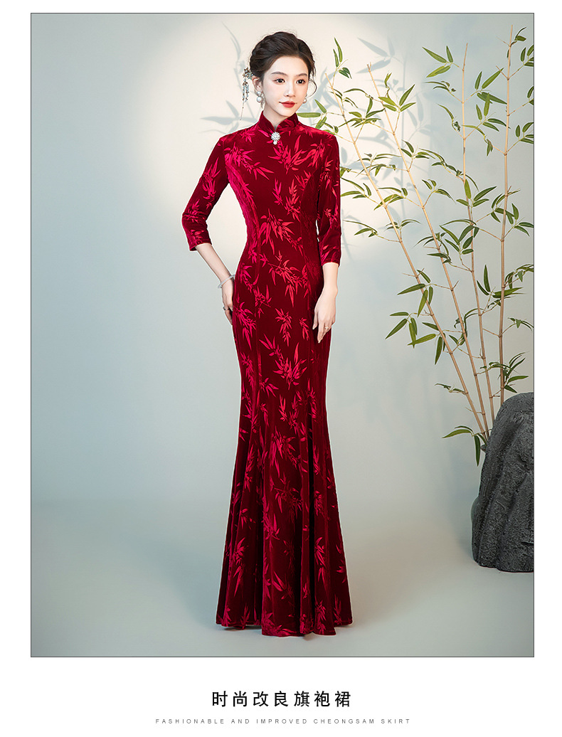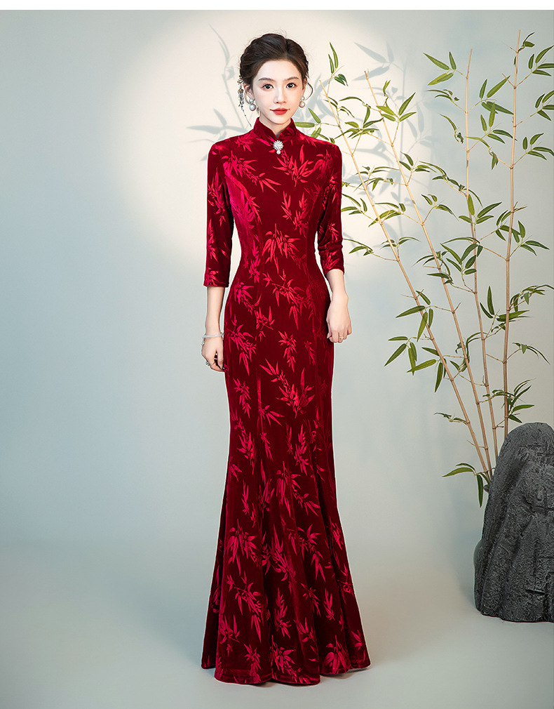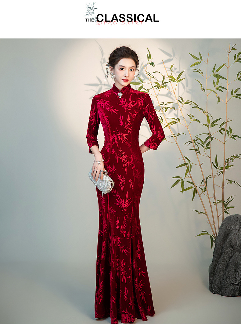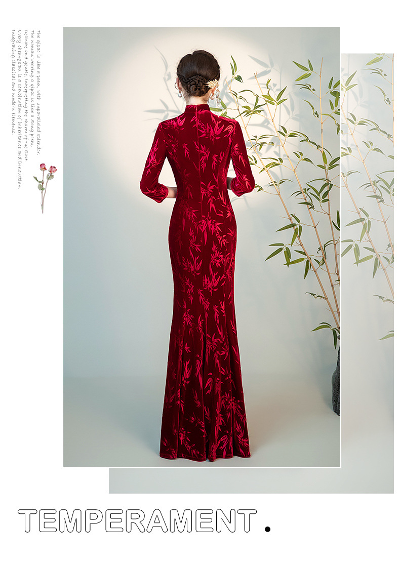 改良型レッドベルベットフィッシュテールロングチャイナドレス 秋の新作 高級感あふれる母親の結婚式や宴会用ドレス 大きいサイズ 日常着