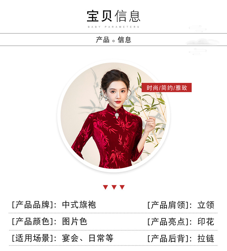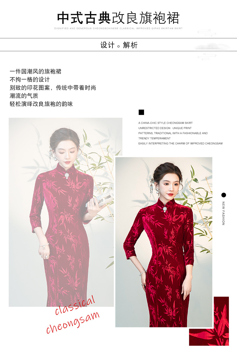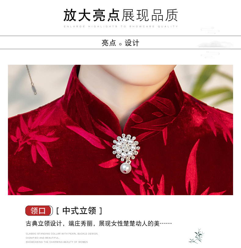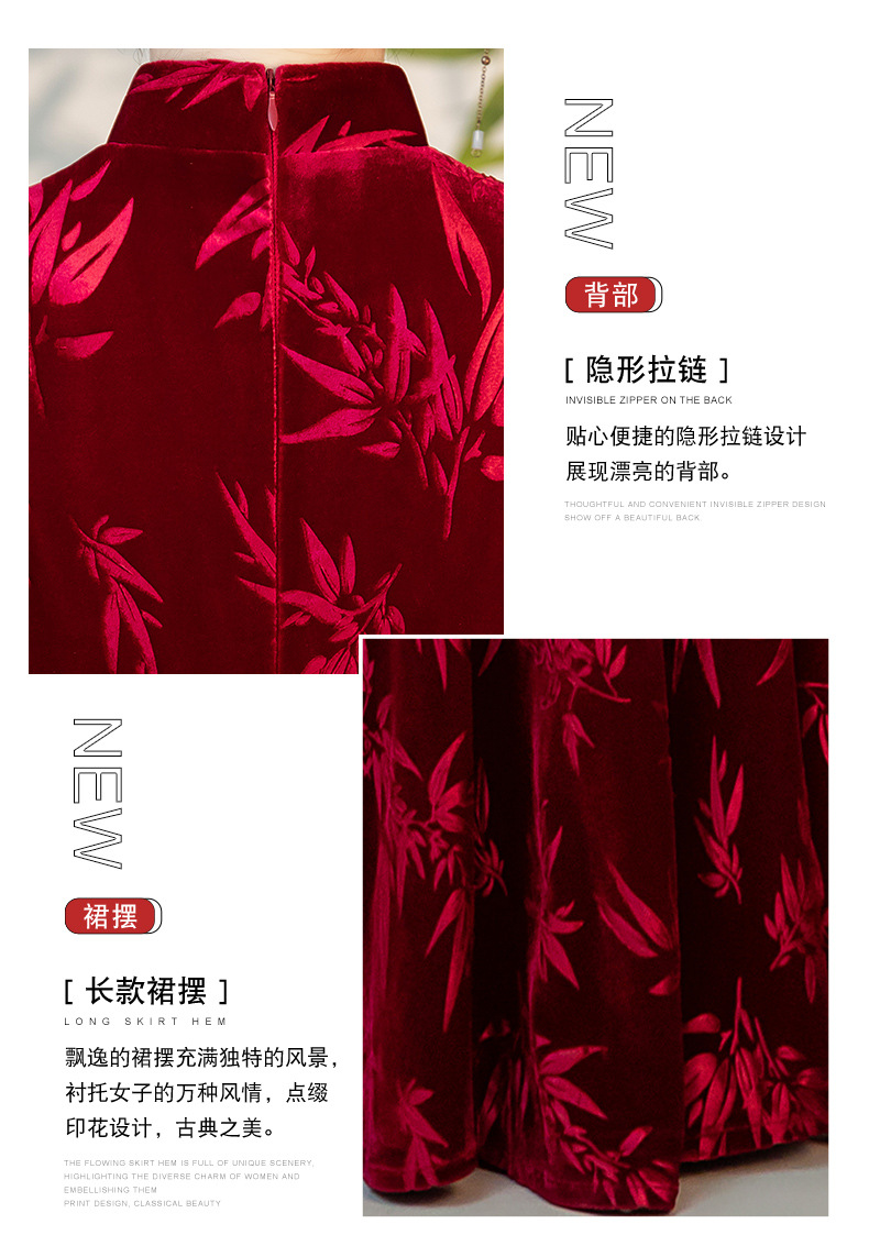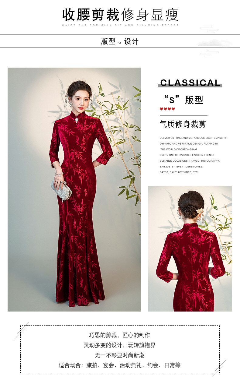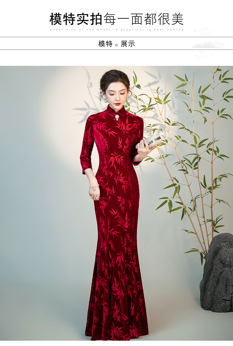 改良型レッドベルベットフィッシュテールロングチャイナドレス 秋の新作 高級感あふれる母親の結婚式や宴会用ドレス 大きいサイズ 日常着