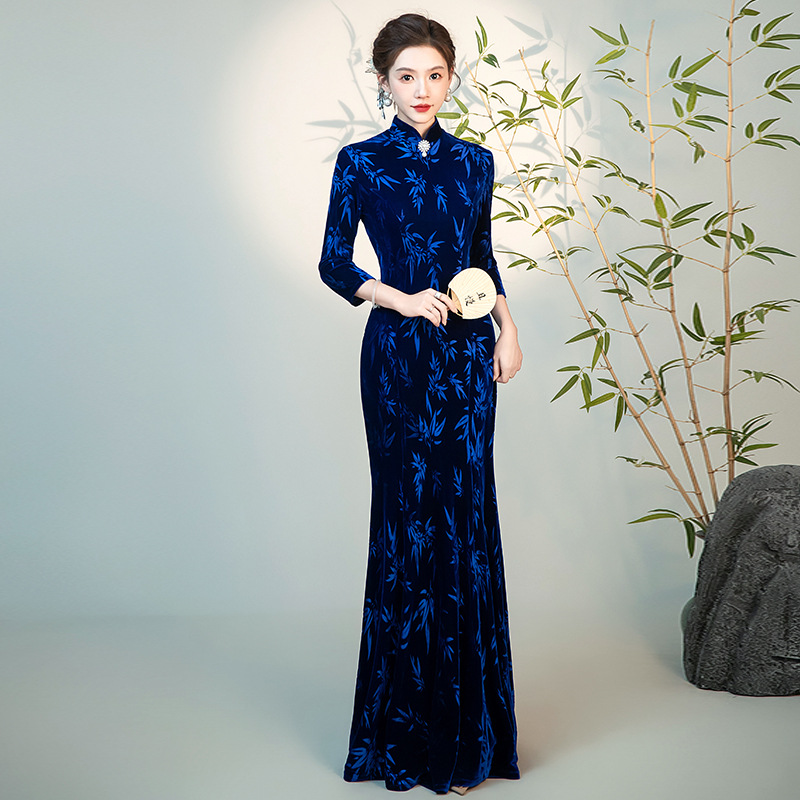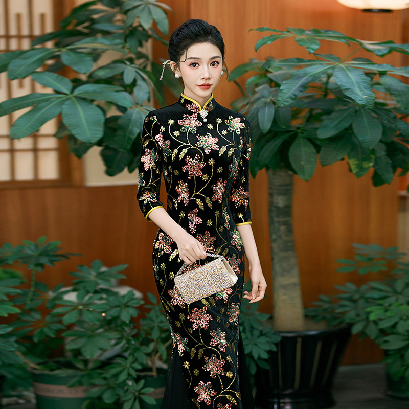 秋の新作ベルベットフィッシュテールチャイナドレス、ロング丈、エレガントでレトロなママ向け、大きいサイズ、日常着に最適な改良型ワンピース