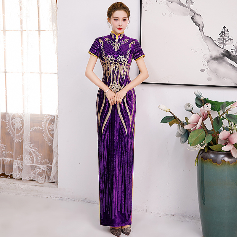 紫色の走秀旗袍、母親向け、若い中国風、新作、金糸入りスパンコール、スリット入り、舞台衣装、ワンピース
