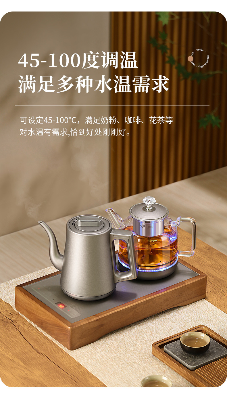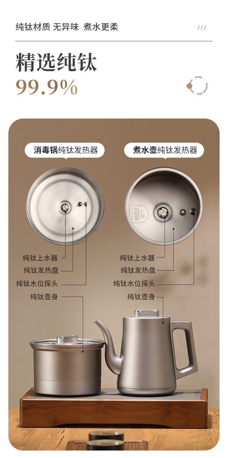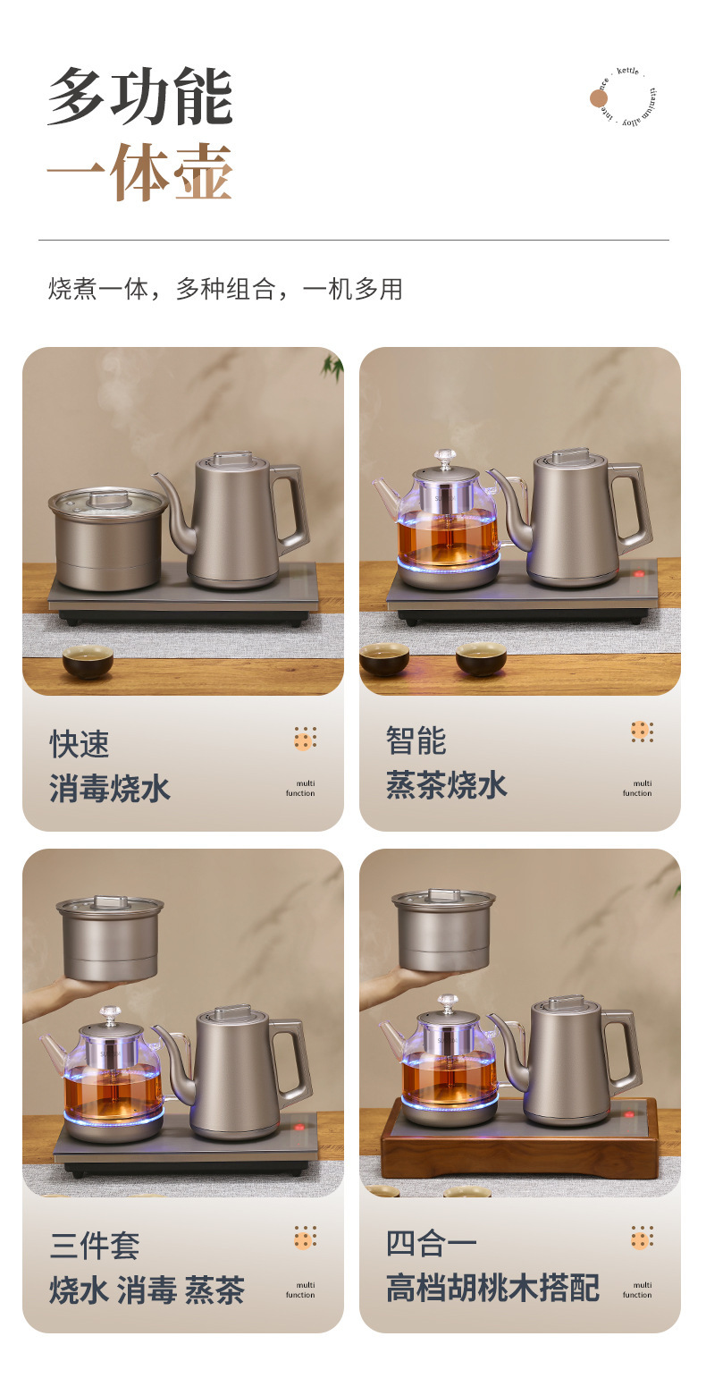 8:煮杯款为一边是烧水壶一边是煮杯子的消毒锅;蒸茶款为一边是烧水壶,一边是蒸茶的蒸茶壶;三合一是一个烧水壶+一个消毒锅+一个蒸茶壶,四合一是在三合一的基础上增加了木框。