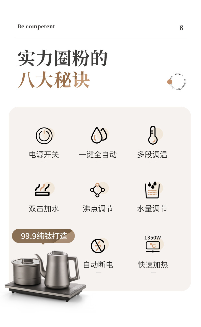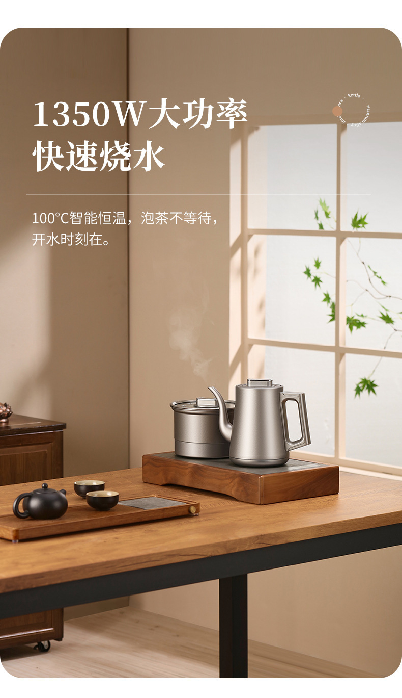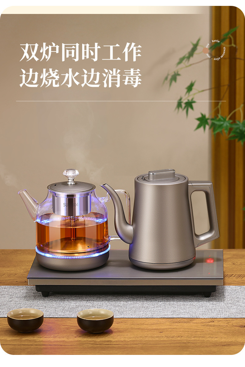 8:煮杯款为一边是烧水壶一边是煮杯子的消毒锅;蒸茶款为一边是烧水壶,一边是蒸茶的蒸茶壶;三合一是一个烧水壶+一个消毒锅+一个蒸茶壶,四合一是在三合一的基础上增加了木框。