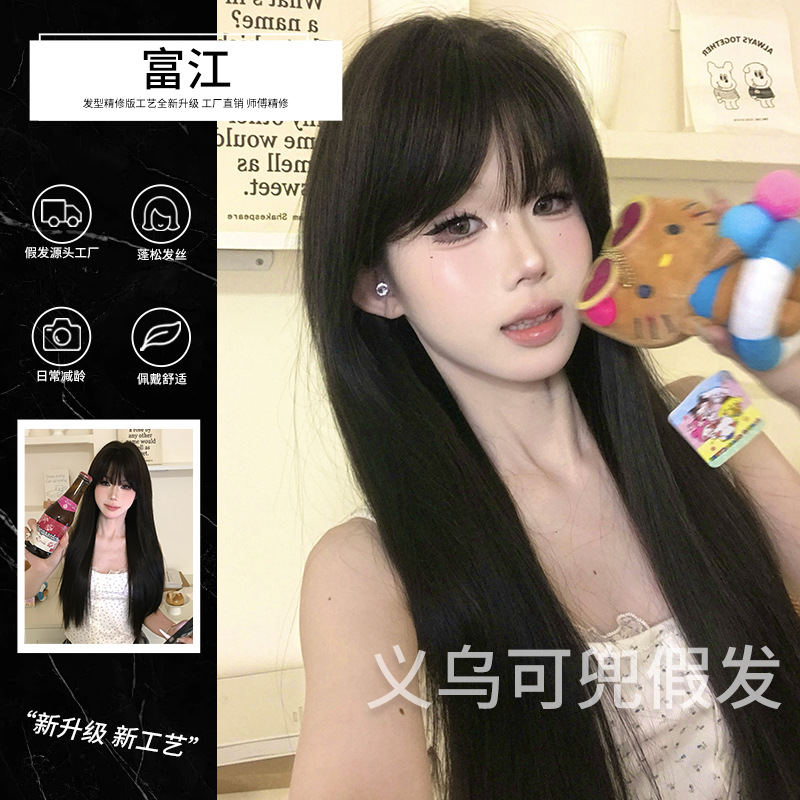 カツラの夏の新型女性は自然にリアルな前髪の黒いストレートの丸い顔をしています。