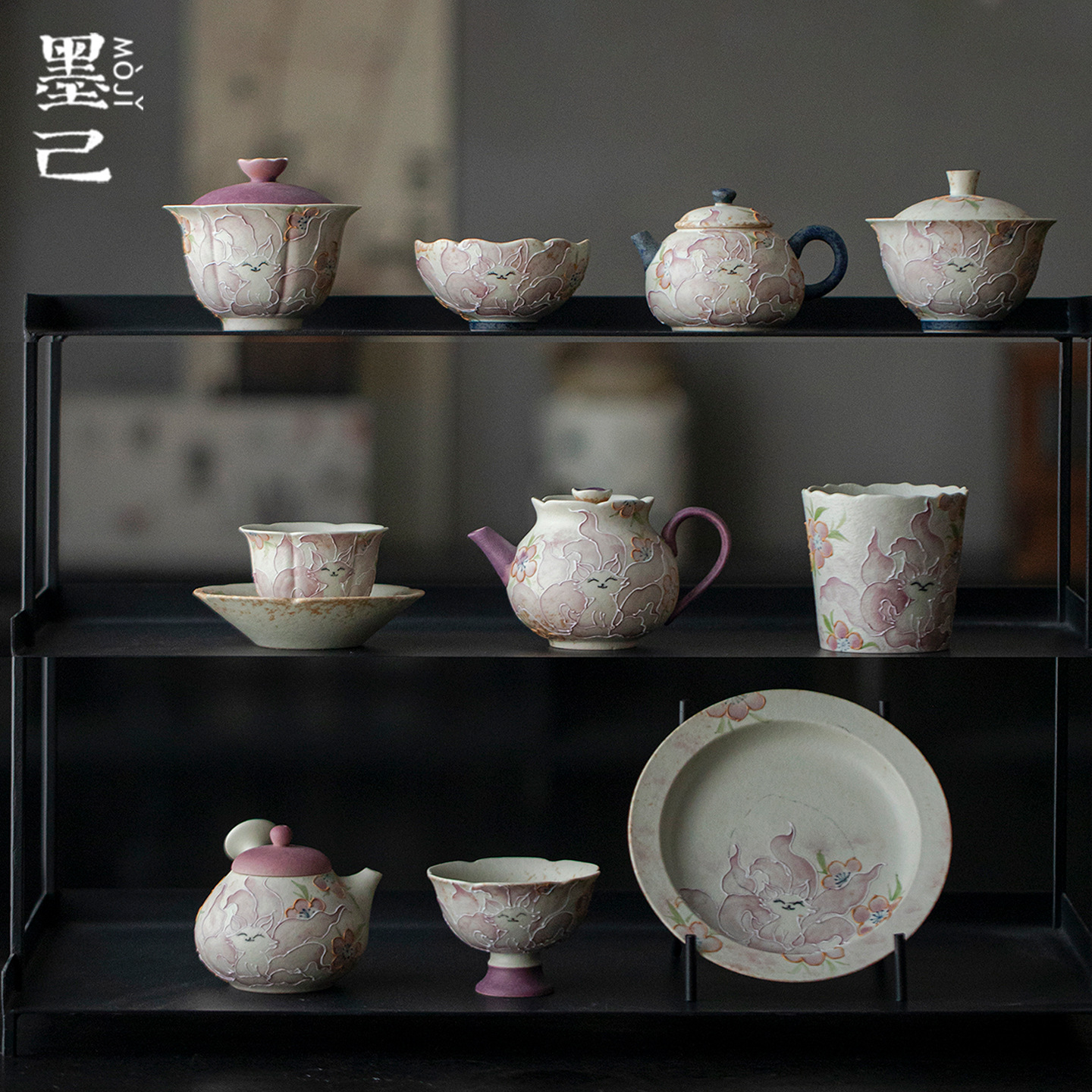 墨己火石红手绘九尾狐仿古功夫茶具合集家用茶壶盖碗主人杯茶杯