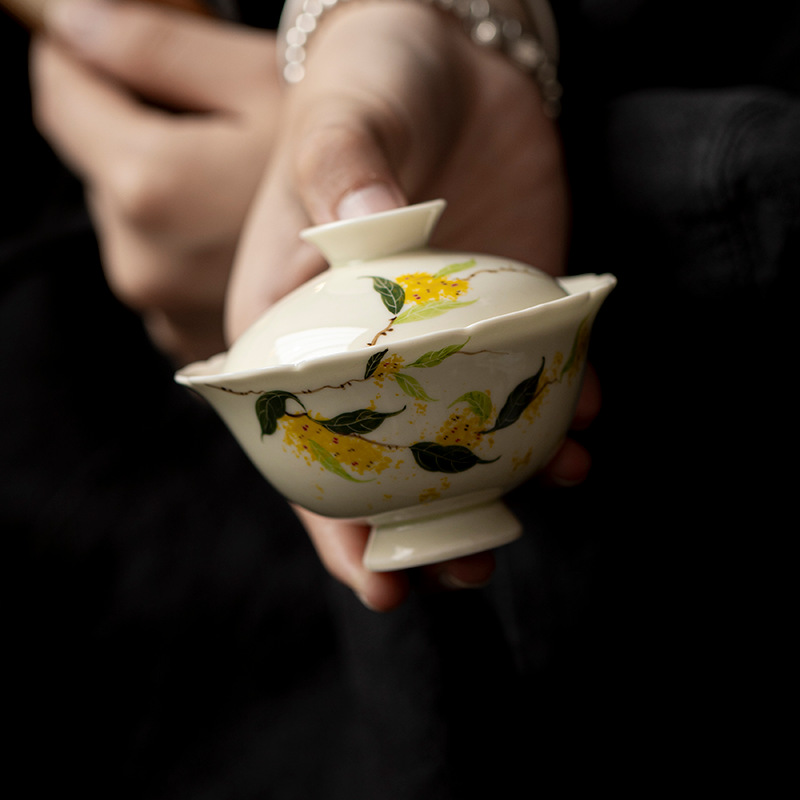 手描き桂花二才蓋碗茶杯中国式工夫茶器家庭用釉薬下彩陶磁器泡茶器トランペット茶碗