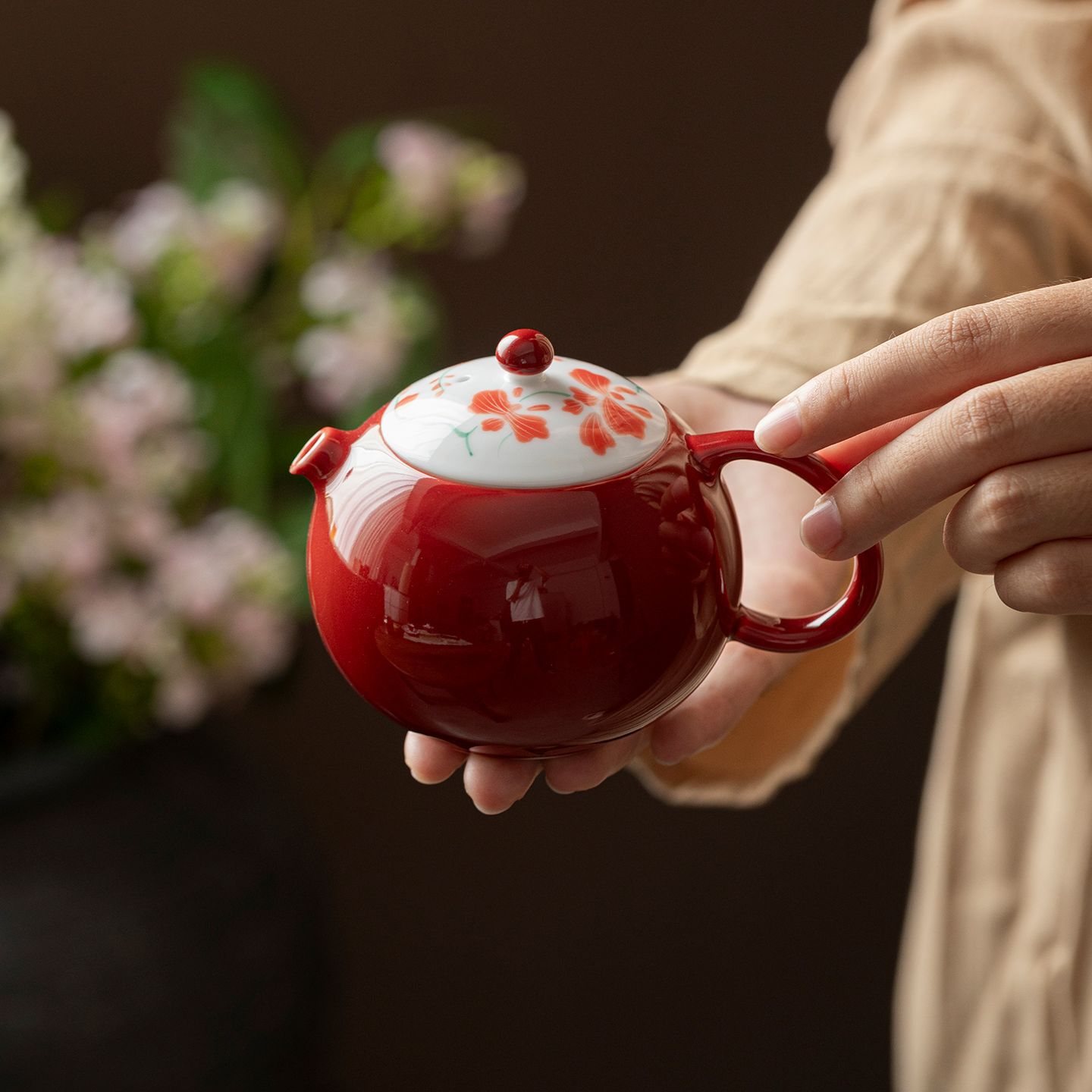 祭红釉蝴蝶兰花西施壶手绘陶瓷茶壶带球孔过滤红色泡茶壶功夫茶具