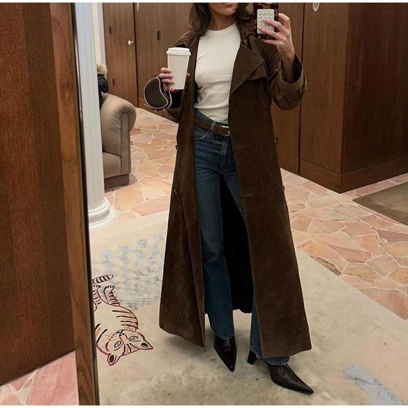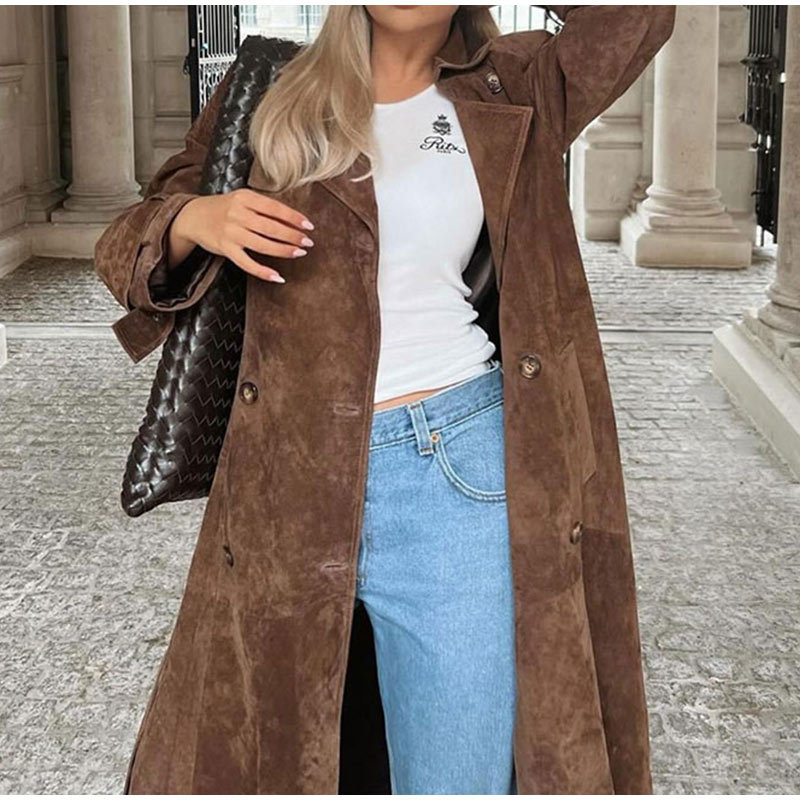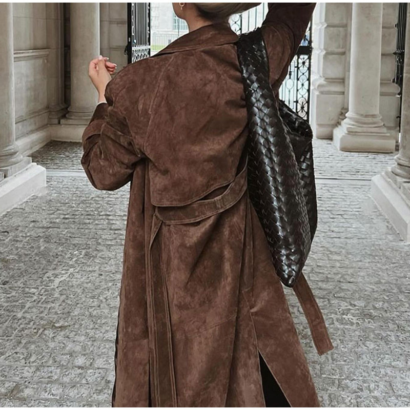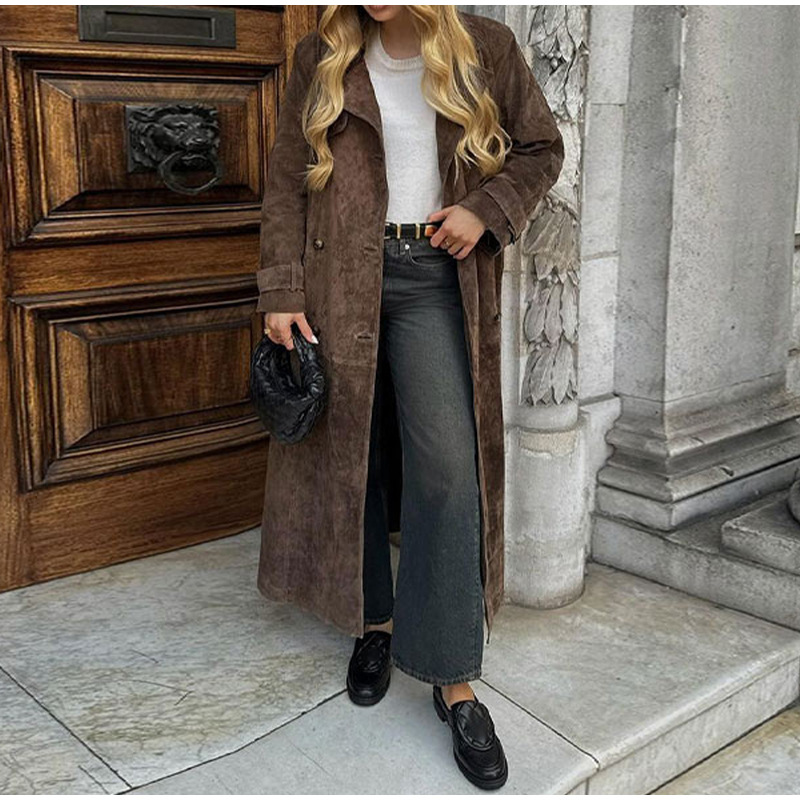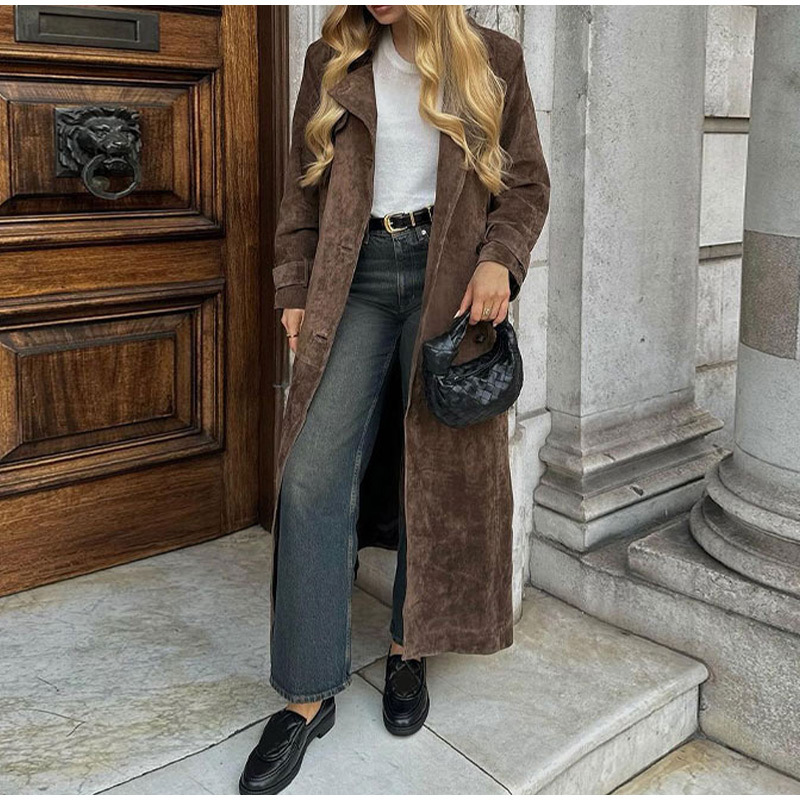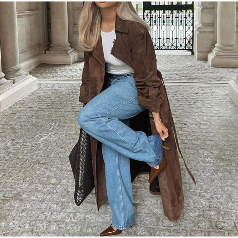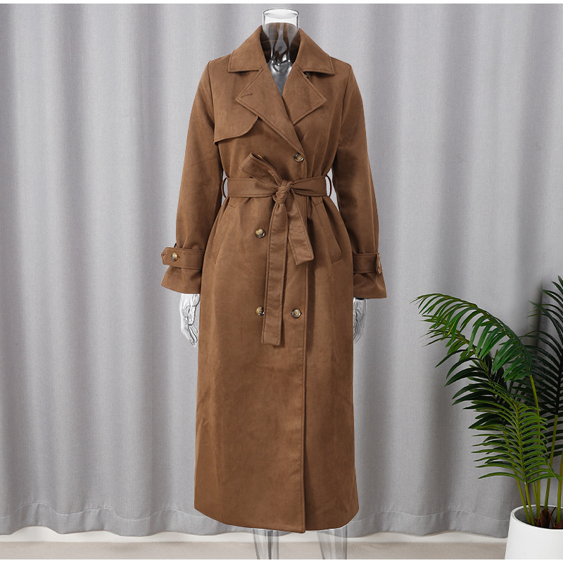 欧美跨境女装2025秋季麂皮绒经典气质优雅卡其色翻领大衣风衣外套