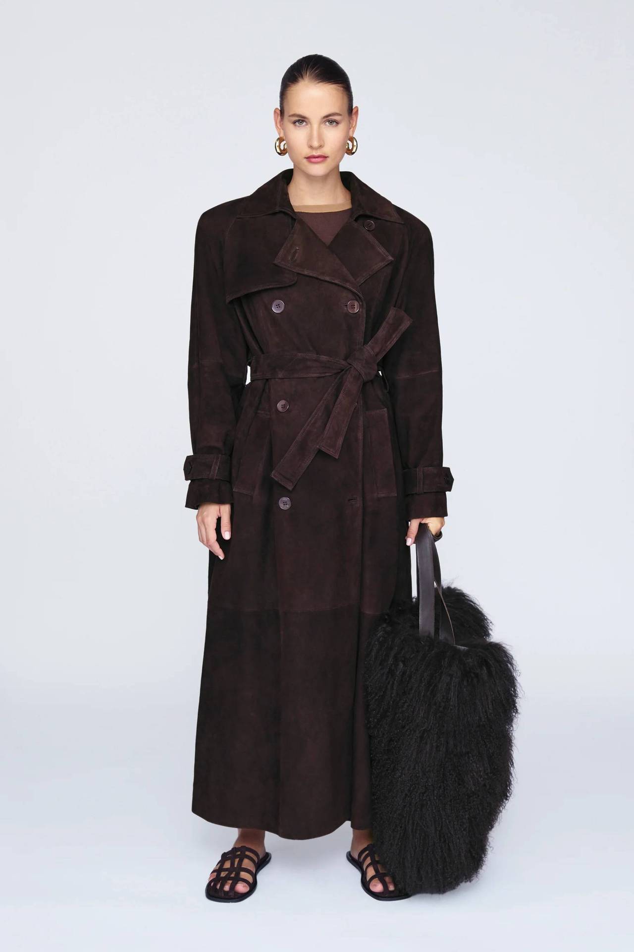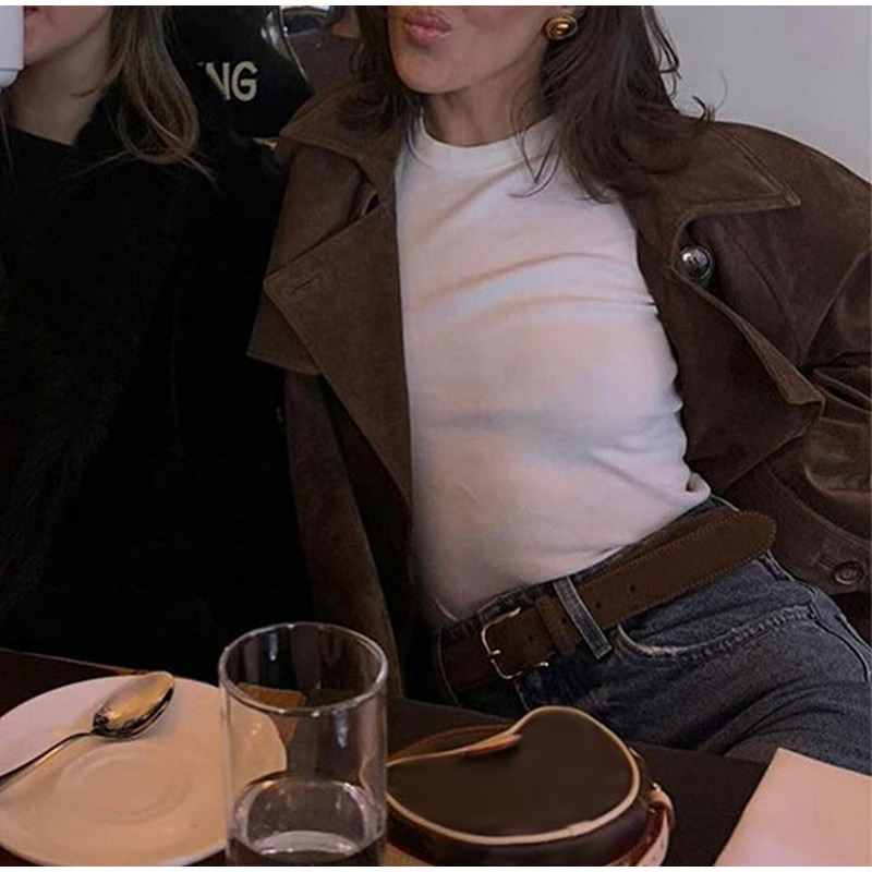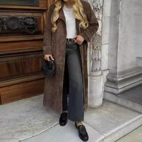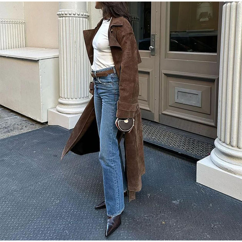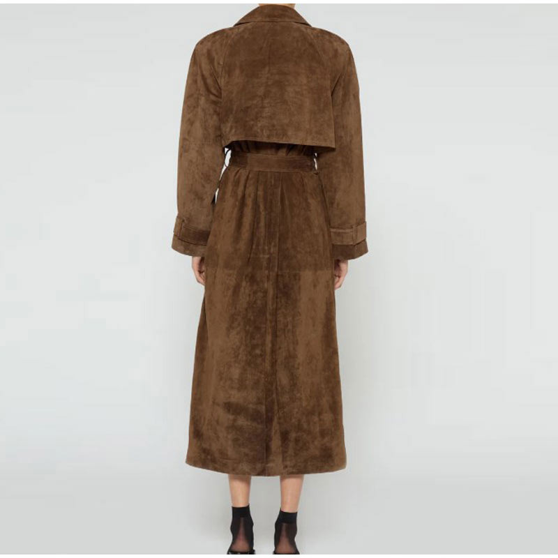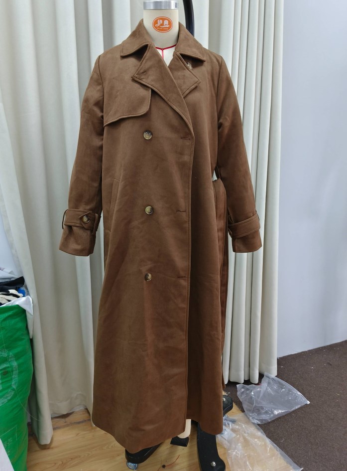欧美跨境女装2025秋季麂皮绒经典气质优雅卡其色翻领大衣风衣外套