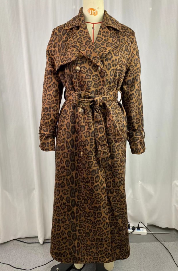 女士中长款麂皮绒皮风衣豹纹过膝外套大衣一件代发欧美潮流