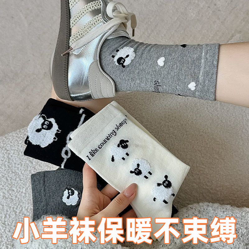 日系可爱小羊袜子女中筒袜ins潮纯棉夏季长款卡通字母春秋长袜
