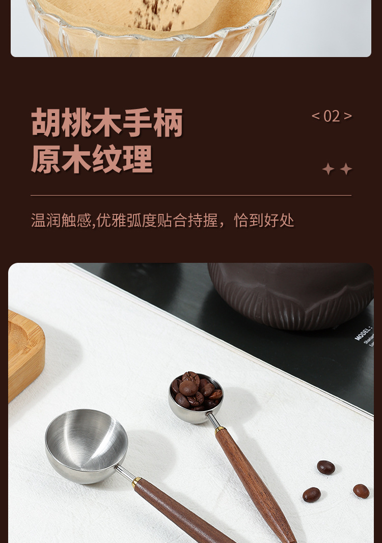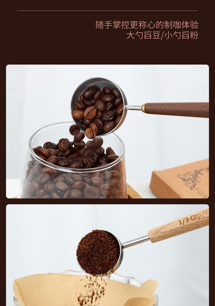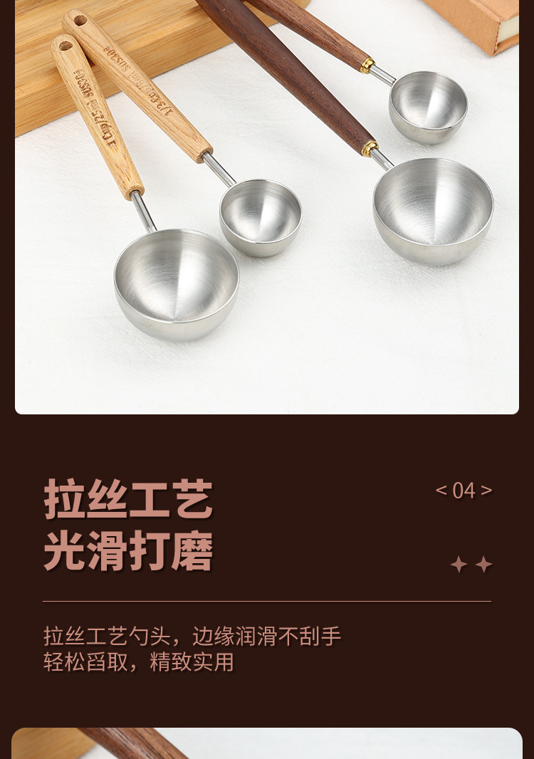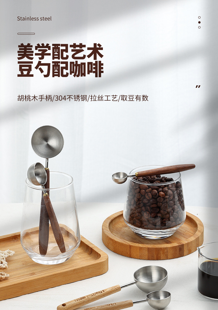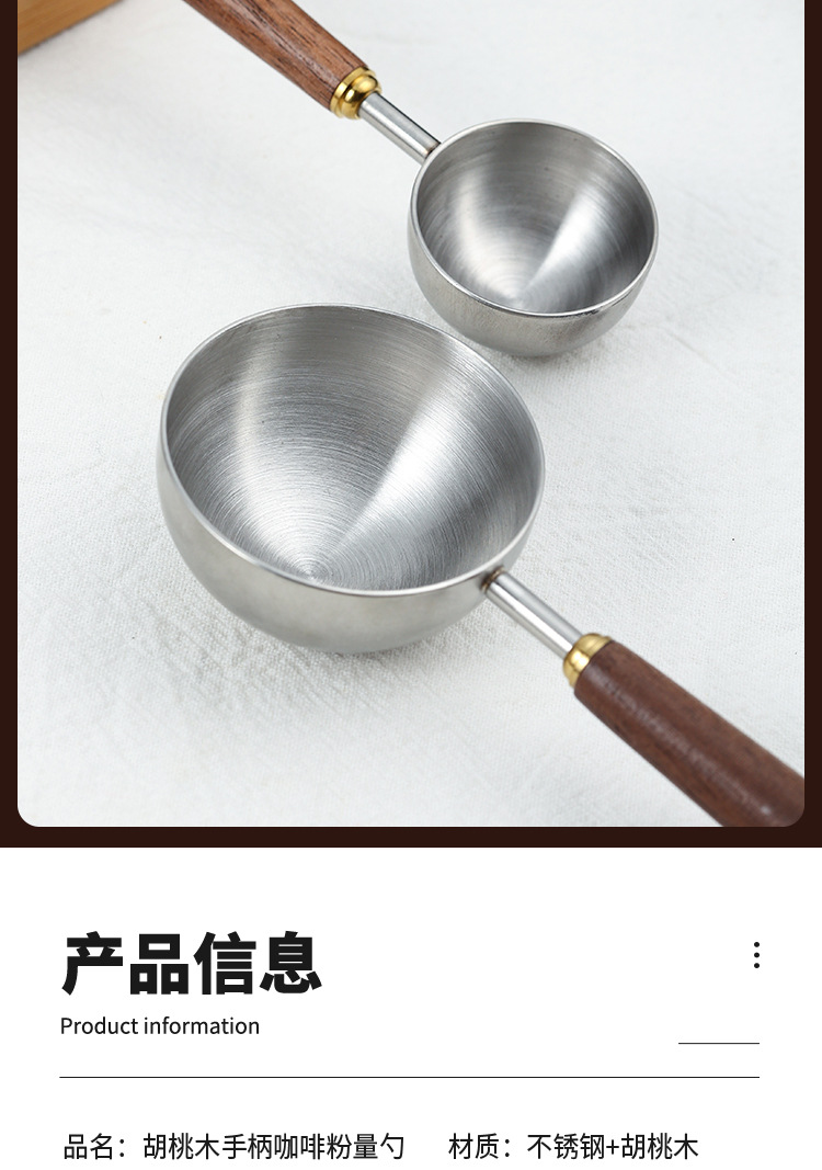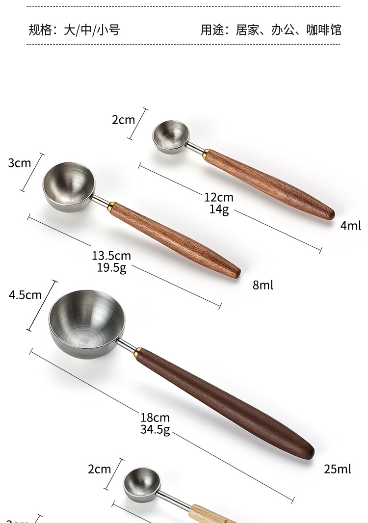 跨境304不锈钢咖啡豆量勺胡桃木柄食品刻度勺子果粉奶茶粉调味匙