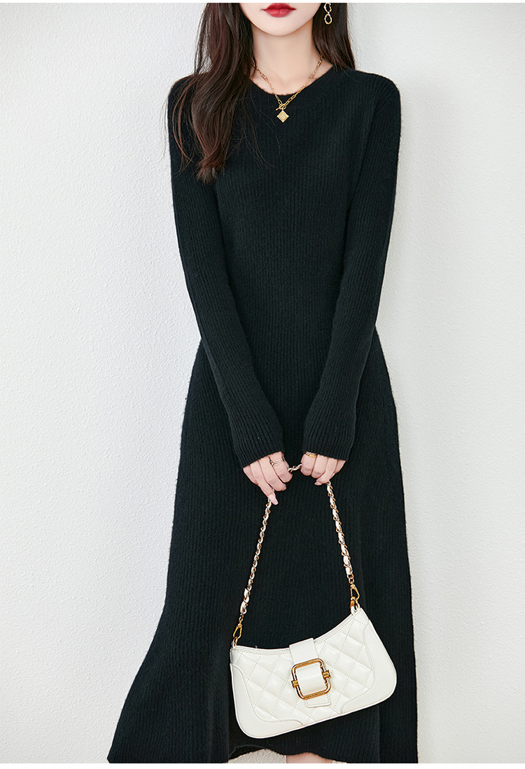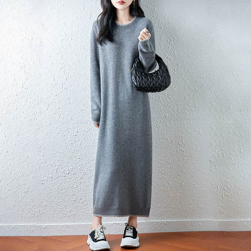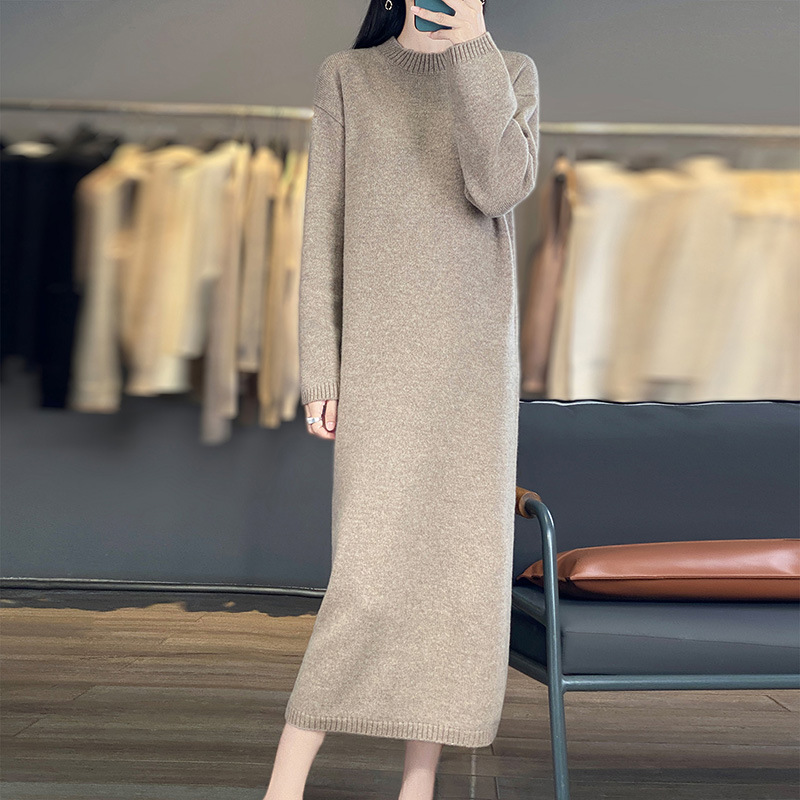 100纯羊毛连衣裙女秋冬新款圆领长袖宽松下摆羊绒毛衣针织长裙
