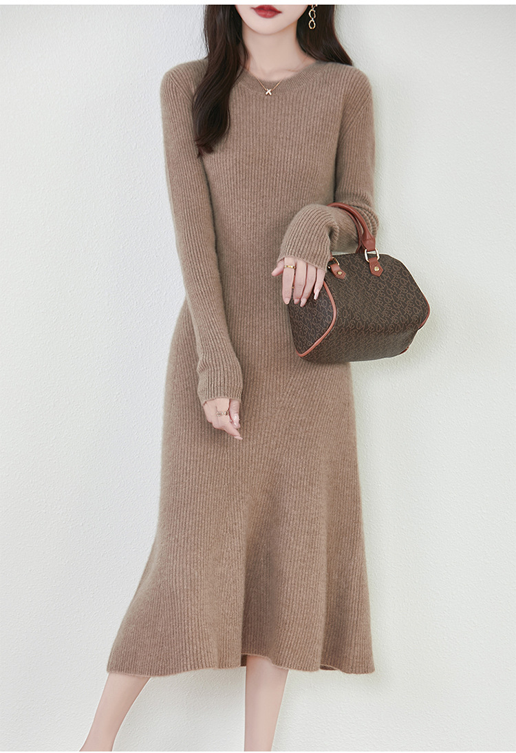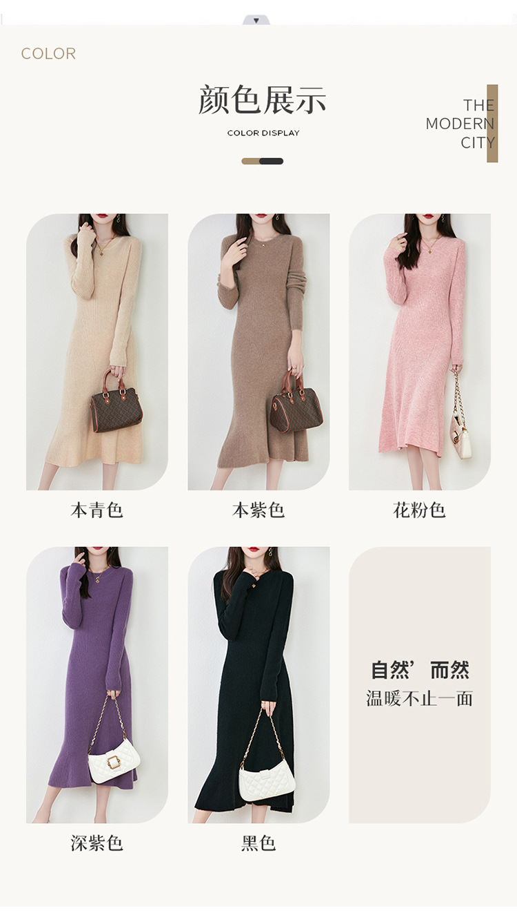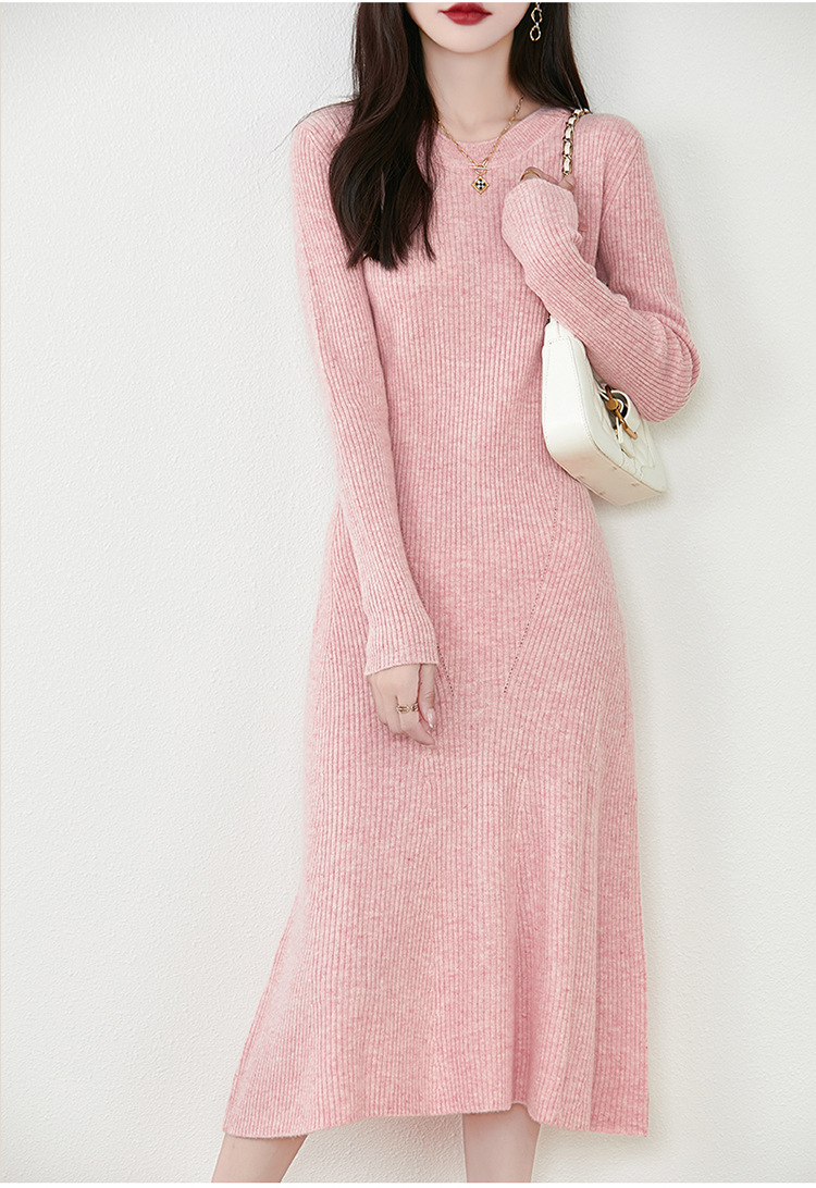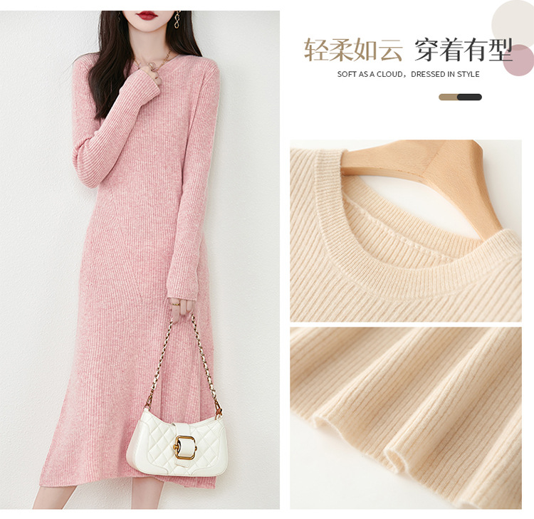 温柔圆领长袖100纯羊毛针织连衣裙女士长款内搭纯色毛衣时尚长裙
