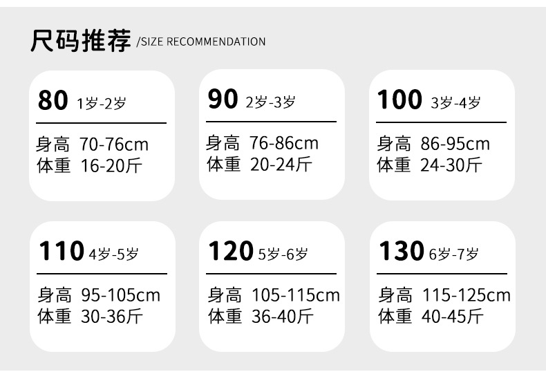 適切な身長 80 (身長71-76CM),90 (身長 77-85CM),100 (身長83-90CM),110 (身長90-100CM),120 (身長100-108CM),130 (身長108-118CM)