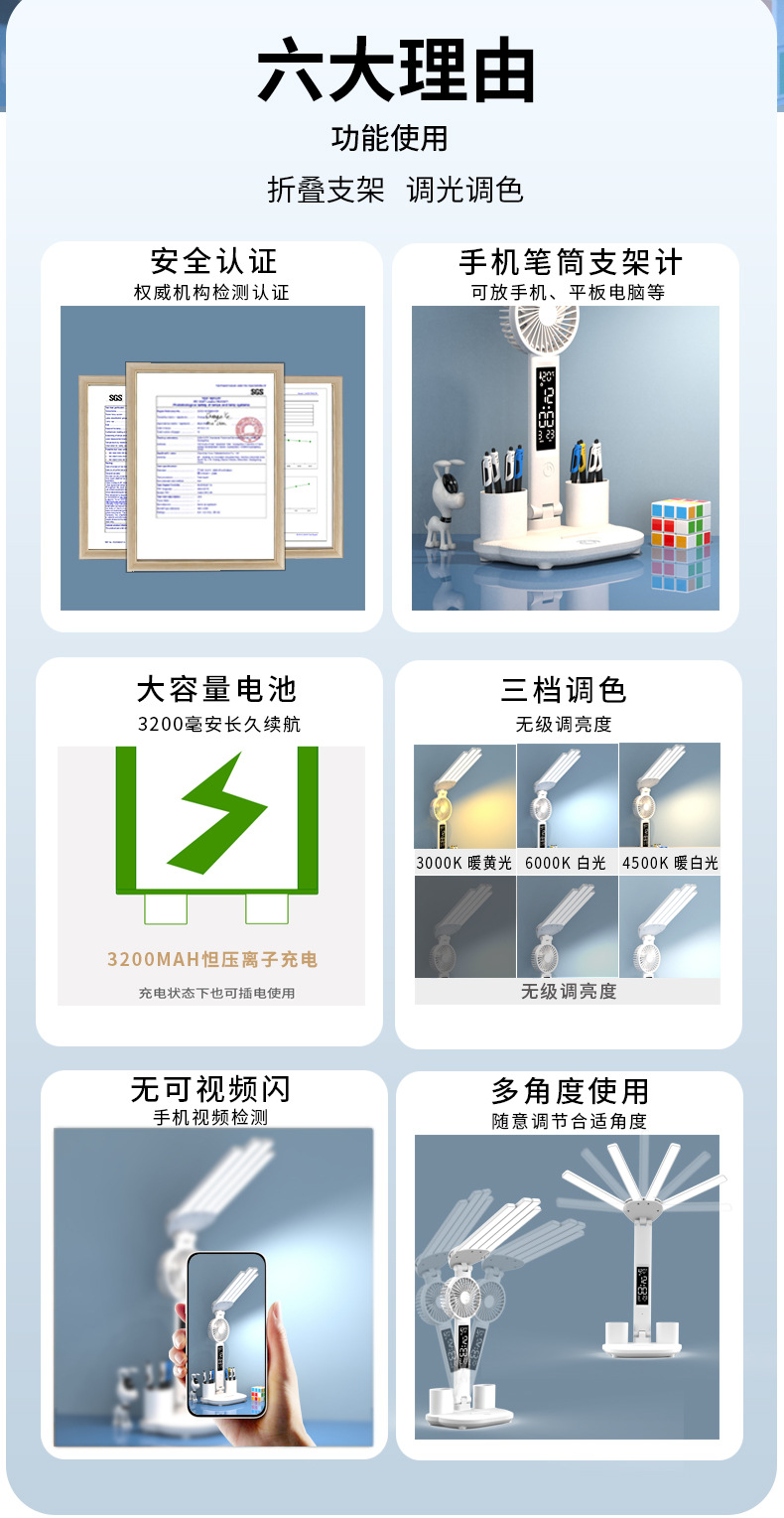 ファンアイスタンドled学習学生寮スマートスタンド寝室充電読書机電気スタンド折り畳み