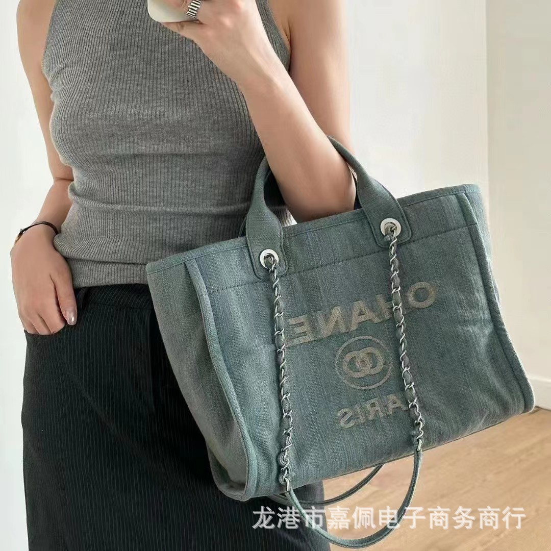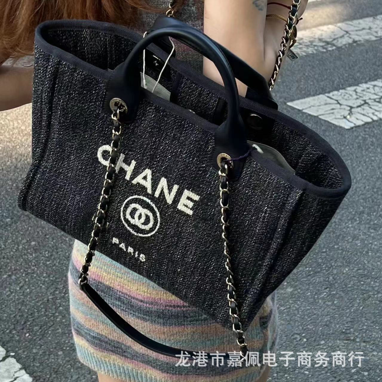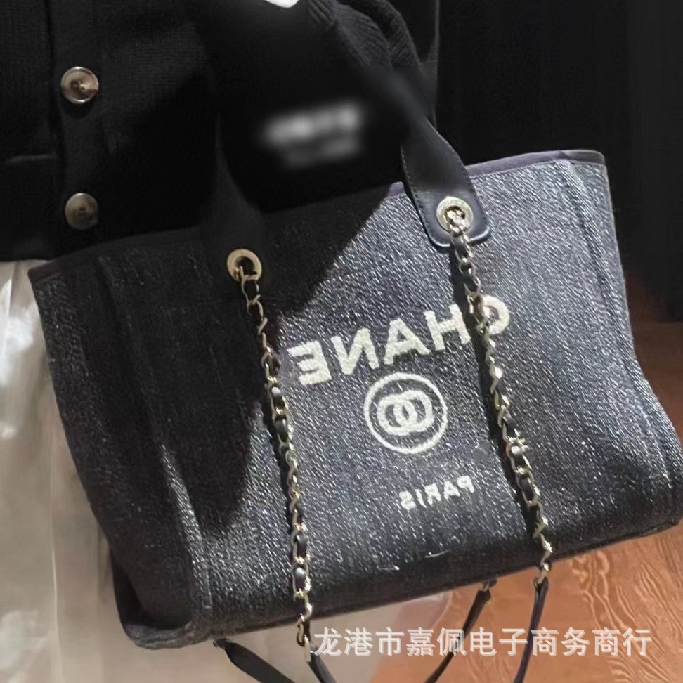 外贸订单高品质纯黑色black帆布牛仔手提链条沙滩包24c托特女包