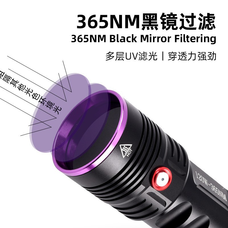 跨境大功率紫光灯滤镜紫外线鉴定UV365烟酒防伪蔬菜荧光检测手电