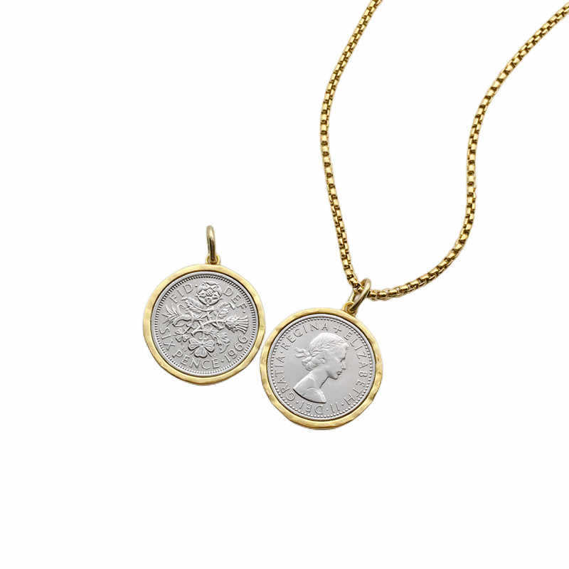 イギリスの六ペンスの硬貨と枠の縁のペンダントのレトロな人は金の銀色の中古のネックレスの大衆のアクセサリに似ています。