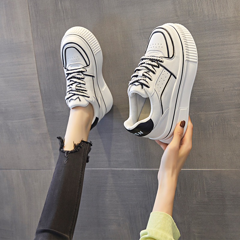 背が高くなった白靴の女性は2025年春秋の新型スポーツ風板靴の厚い底にカジュアルな靴とスカートを合わせた