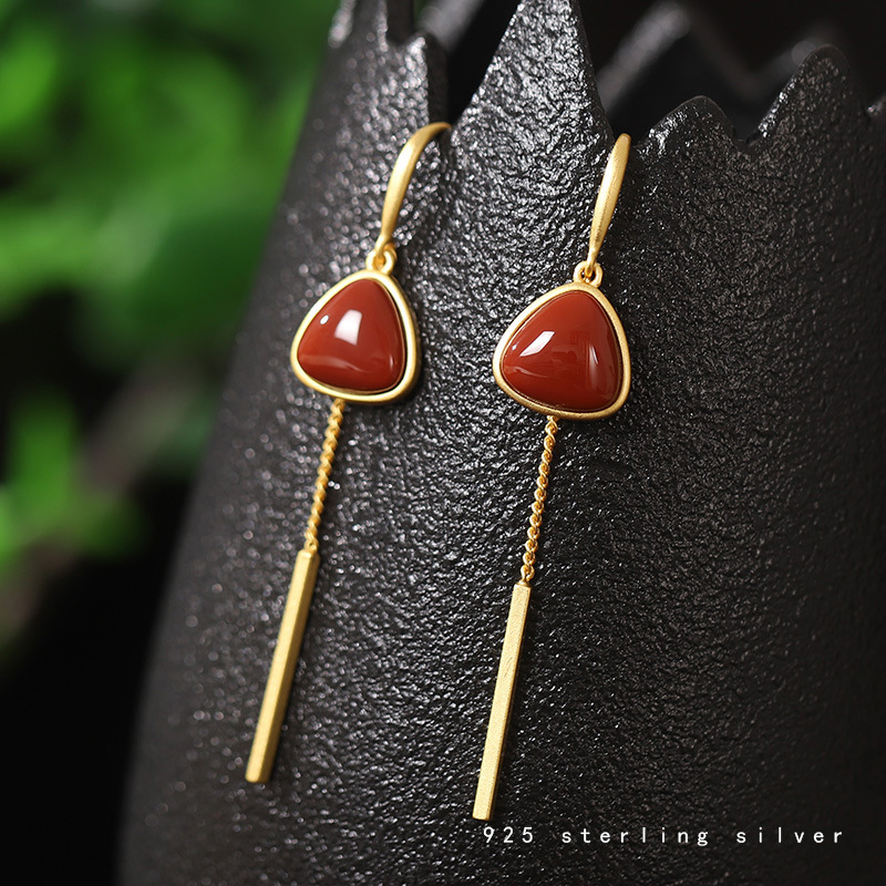 S925純銀金メッキ南紅瑪瑙耳フックラウンド三角シンプル百合耳飾り気質女性ロングタイプ耳糸
