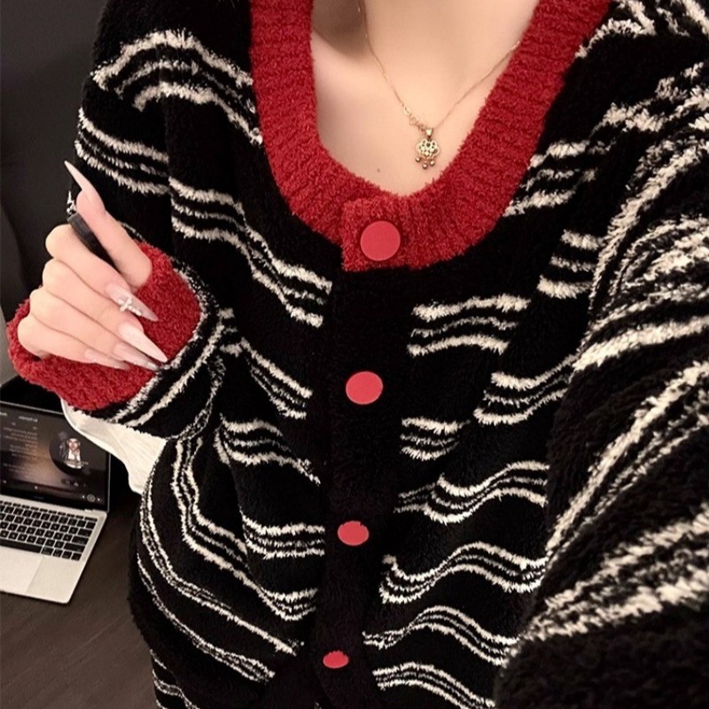 2025年冬季新款韩版甜美复古黑白条纹半边绒睡衣女加厚韩版家居服
