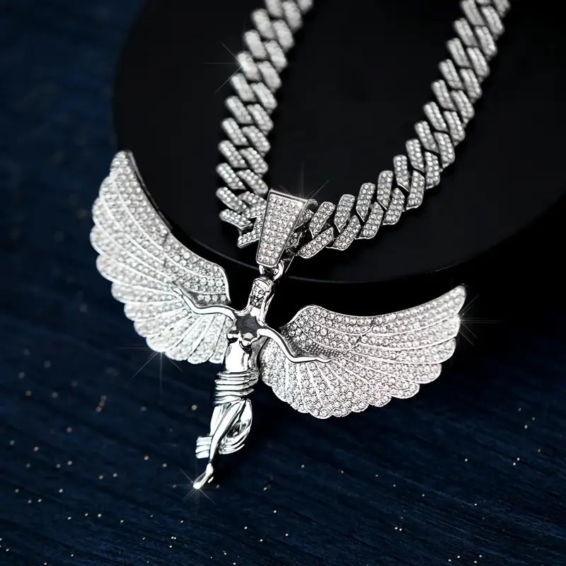 爆発的なヨーロッパとアメリカのライト高級フルダイヤモンド天使の羽亜鉛合金大型ペンダントパーソナライズされたヒップホップシンプルなスタイルのネックレス