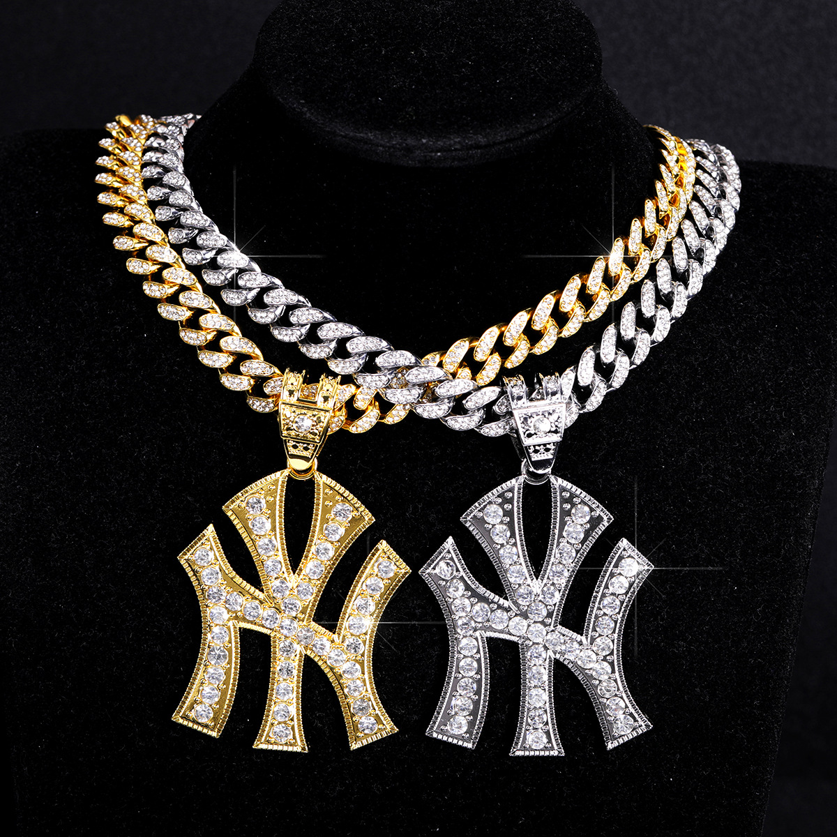 欧美跨境热卖合金满钻MLB纽约洋基棒球队吊坠搭配嘻哈个性古巴链