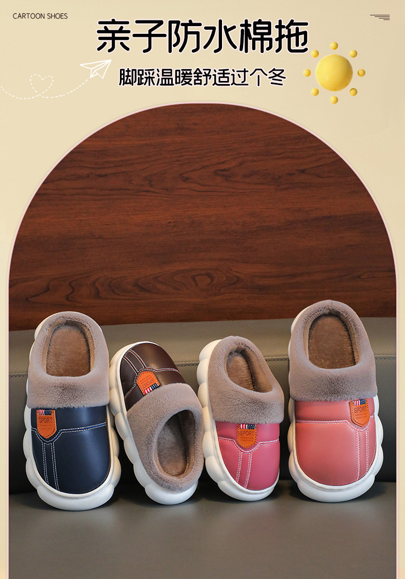 儿童棉拖鞋PU皮防水软底防滑加绒加厚亲子成人情侣居家冬季保暖