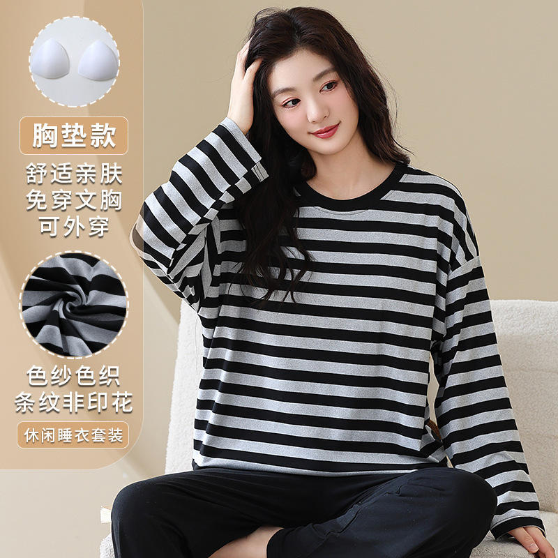 加肥大码5XL带胸垫春秋季睡衣女士色织条纹长袖套装可外穿家居服