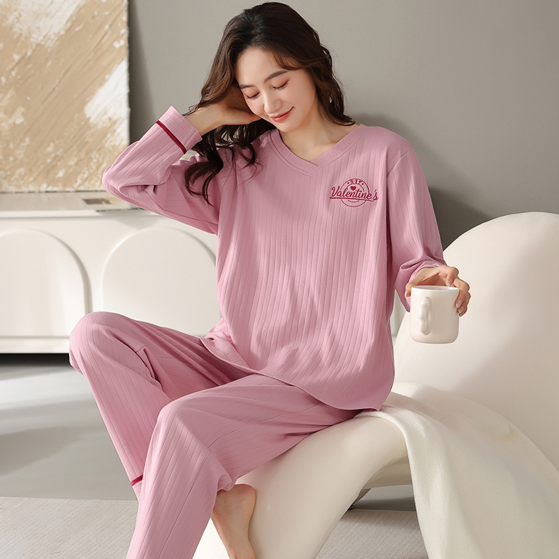 源头工厂精梳棉加肥大码睡衣少女春秋季V领可外穿200斤家居服套装